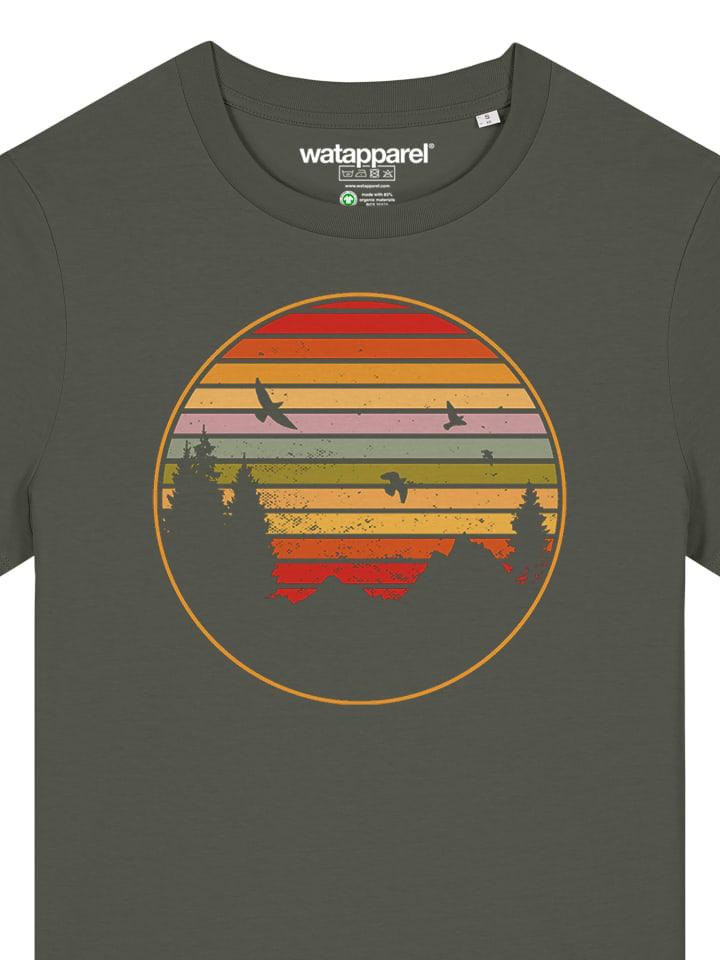 Футболка Закат, горы и ели цвета хаки wat? Apparel