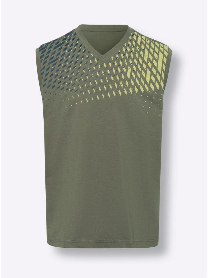 Спортивная майка с графическим принтом спереди и однотонной спинкой. V-образный вырез. Изготовлена из приятной для кожи ткани.