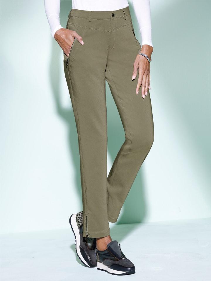 Создает отличную фигуру: эти брюки с утягивающим поясом, слегка утягивающим поясом из техно-стрейч ткани и утягивающей кокеткой обеспечивают плоский живот и отличный эффект пуш-ап в области ягодиц. Они имеют фигурный пояс с застежкой на пуговицу и молнию, а также шлевки для ремня. Два боковых кармана на молнии с декоративными швами создают эффект удлинения. Также сзади есть два накладных кармана. Низ застегивается на молнию. Длина брючины примерно 36 см. Ремень в комплект не входит.
