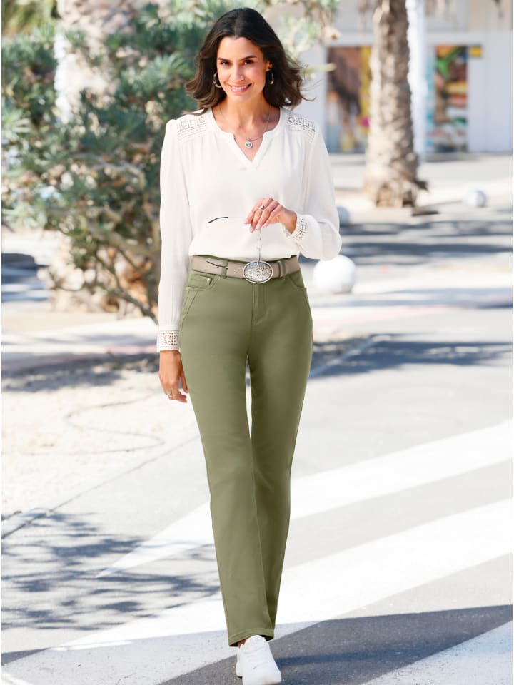 Удобные джинсы с пятью карманами и привлекательными деталями: косые декоративные швы под закругленными передними карманами и заклепки. Формованный пояс со шлевками для ремня, застежкой на пуговицу и молнию. Кокетка сзади. Мягкая саржевая ткань. Длина брючины примерно 36 см. Ремень в комплект не входит. Поддерживает инициативу «Хлопок, сделанный в Африке».