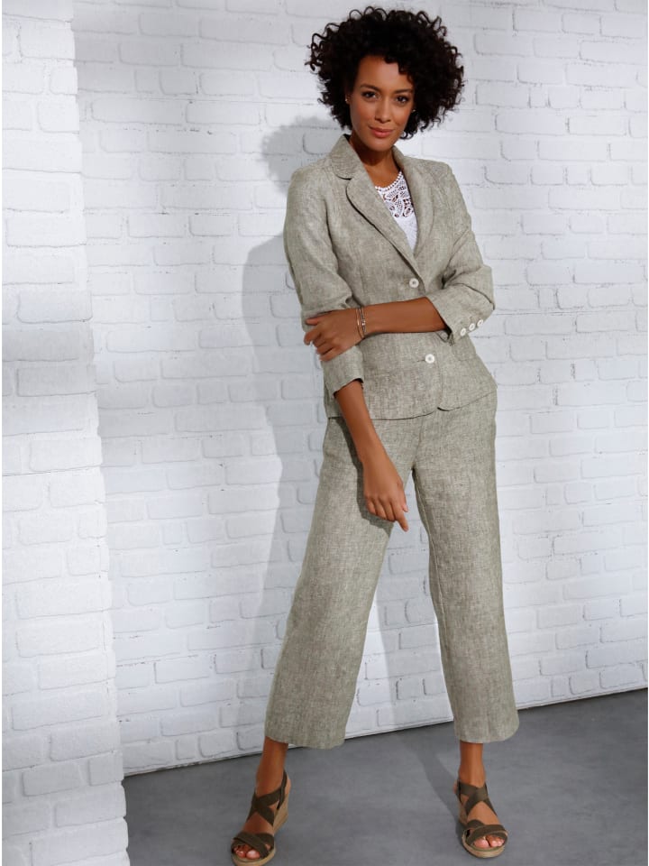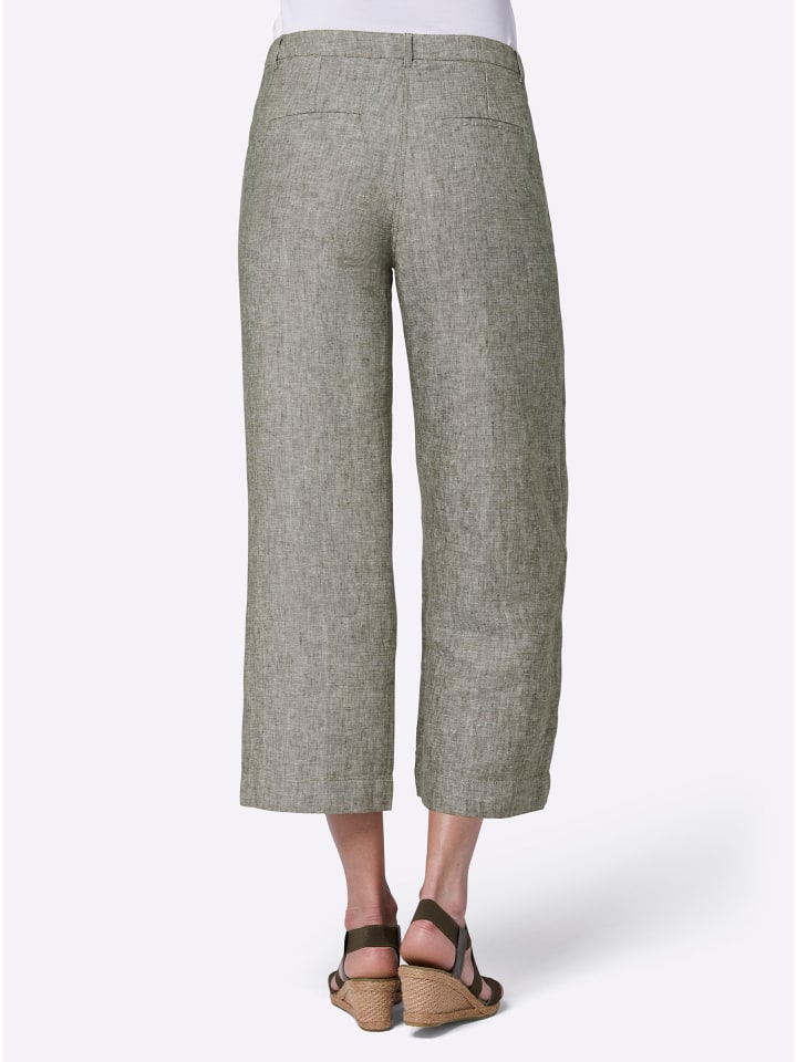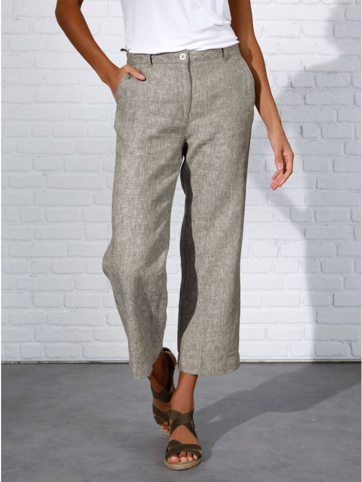 Идеально подходит для теплых дней! Льняные брюки в стиле широких, слегка укороченных кюлотов. Высококачественный лен приятно охлаждает кожу и имеет характерный эффект жатости. Слегка меланжевый. Формованный пояс со шлевками для ремня, застежкой на пуговицу и молнию спереди. Два передних кармана, два ложных кармана спереди сзади. Длина брючины примерно 52 см. Ремень в комплект не входит.