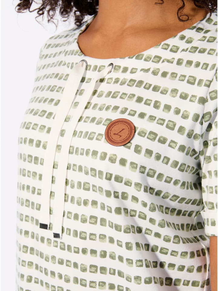 Впечатляюще красивая рубашка с принтом и завязками на круглом вырезе для индивидуальной регулировки ширины. Фиксированные манжеты на пуговицах на коротких рукавах. Передняя часть украшена нашивкой из искусственной кожи. Изделие сертифицировано GOTS.