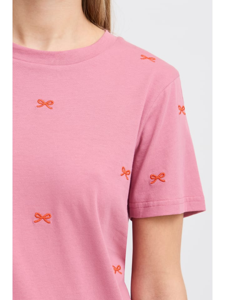 Эта футболка прямого кроя, с короткими рукавами, круглым вырезом и небольшими бантиками, распределенными по всей футболке.