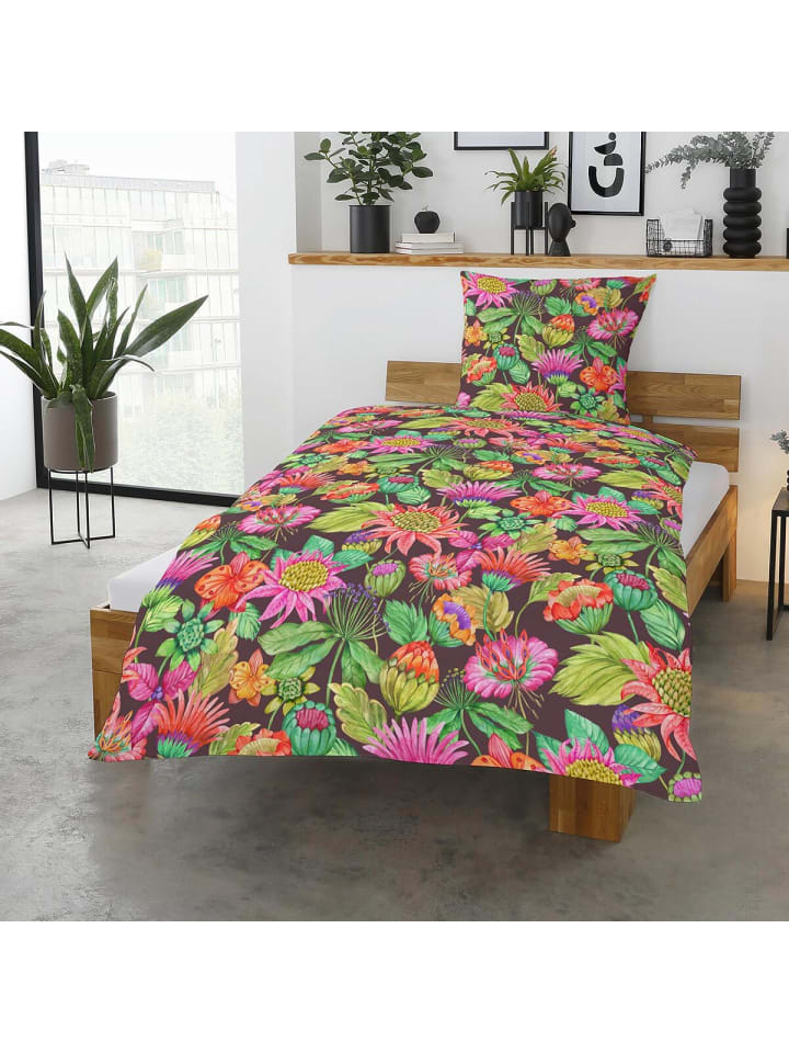 Атласный блеск придает ткани элегантный, эксклюзивный вид и, благодаря своей гладкой поверхности, особенно приятное ощущение на коже. Мако-сатин регулирует влажность, прост в уходе и чрезвычайно долговечен, что делает его идеальным в качестве постельного белья для круглогодичного использования. Особенности включают в себя: - Шикарный дизайн с цветочными акцентами; - Красивые, гармоничные цвета; - Высококачественная молния; - Можно стирать в стиральной машине при температуре 60°C и сушить в сушильной машине; - Приятное на ощупь и приятное на ощупь качество; Материал: 100% хлопок
