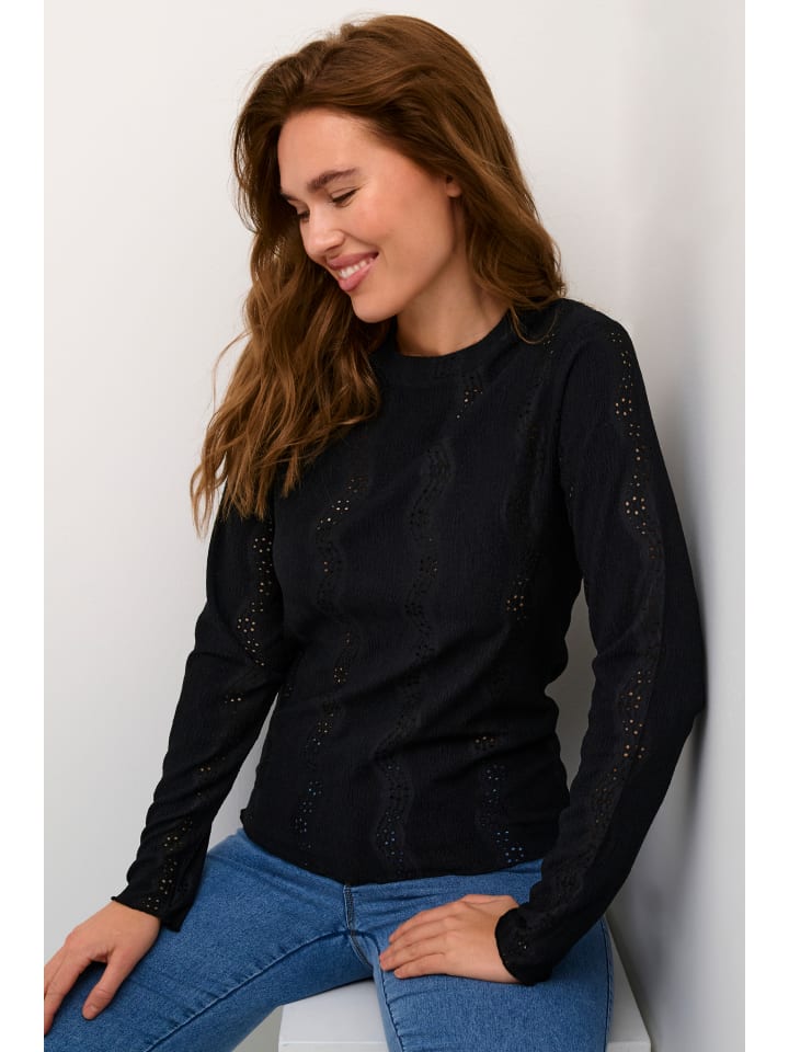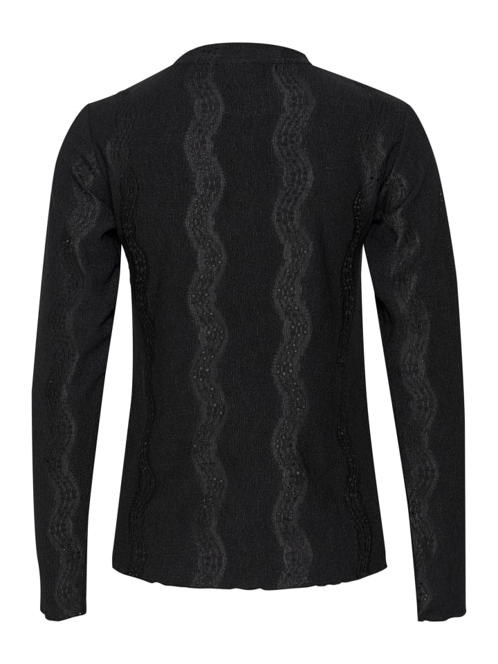 Рубашка с длинными рукавами, полуприталенным кроем, текстурированной поверхностью, круглым вырезом и волнистыми прозрачными вставками на корпусе и рукавах.