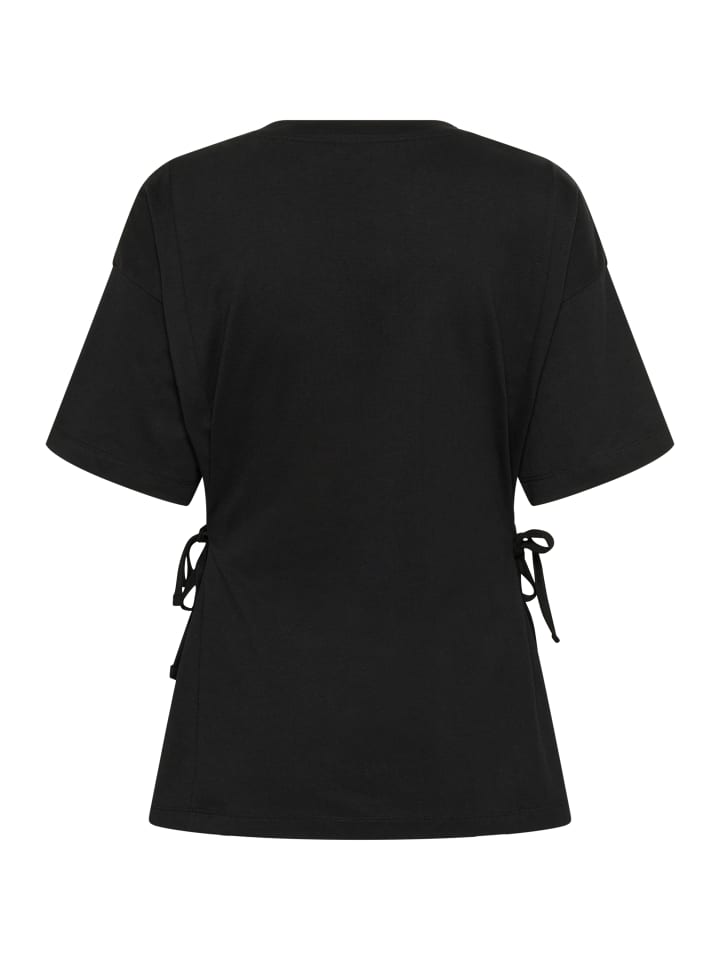Футболка прямого кроя с классическим круглым вырезом, короткими рукавами и изящными завязками по бокам. Гладкая, фактурная поверхность.