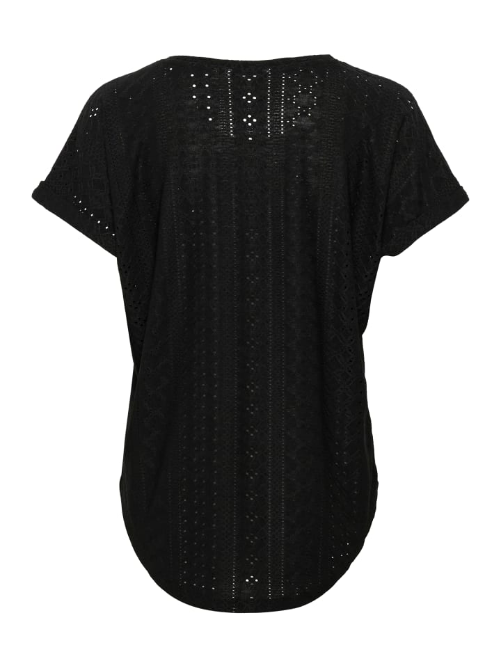 Кружевной топ прямого кроя с круглым вырезом и короткими рукавами. Полностью ажурный дизайн и закругленный подол.