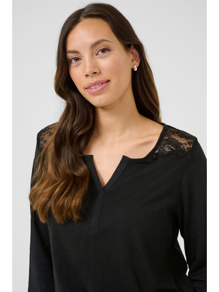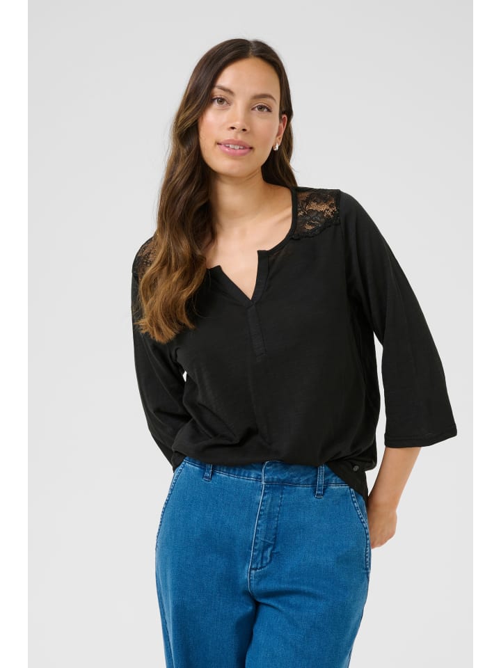 Эта женская рубашка имеет классический крой, V-образный вырез и рукава три четверти. Кружевные детали на плечах придают элегантный вид и обеспечивают универсальный комфорт.
