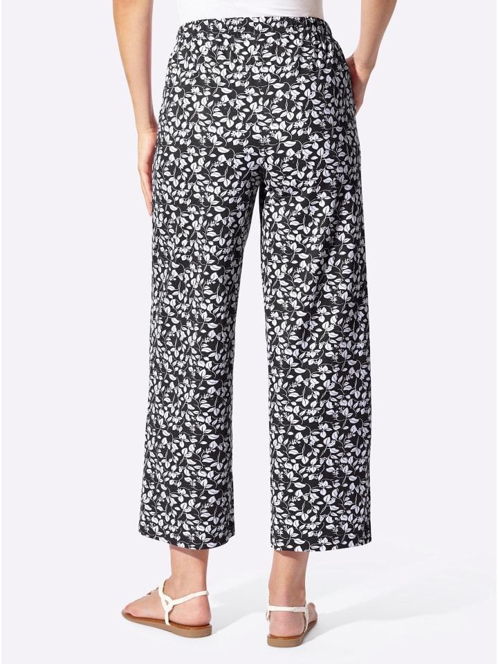 Повседневные брюки-кюлоты с цветочным принтом. Удобный эластичный пояс со шнурком и завязкой. Два кармана. Ширина брючины около 50 см. Сертифицировано GOTS.