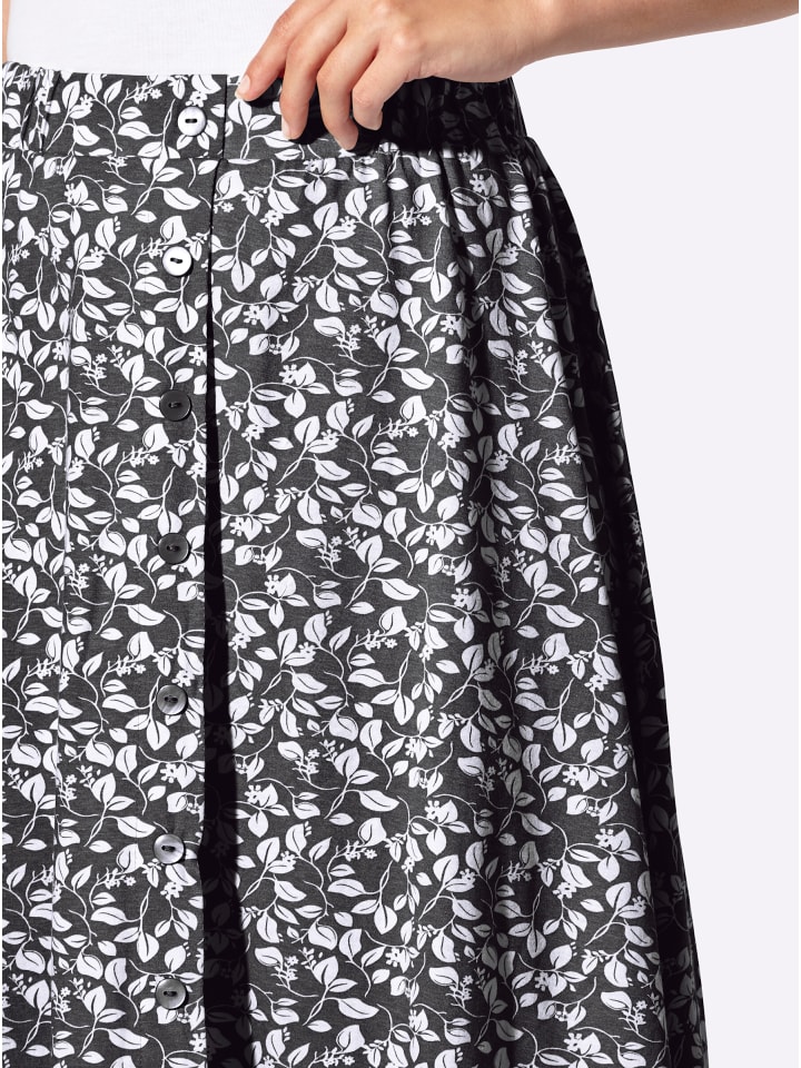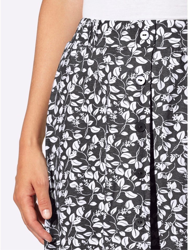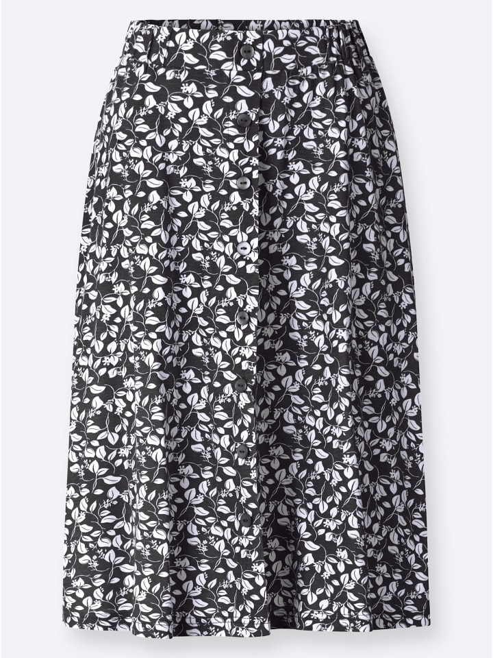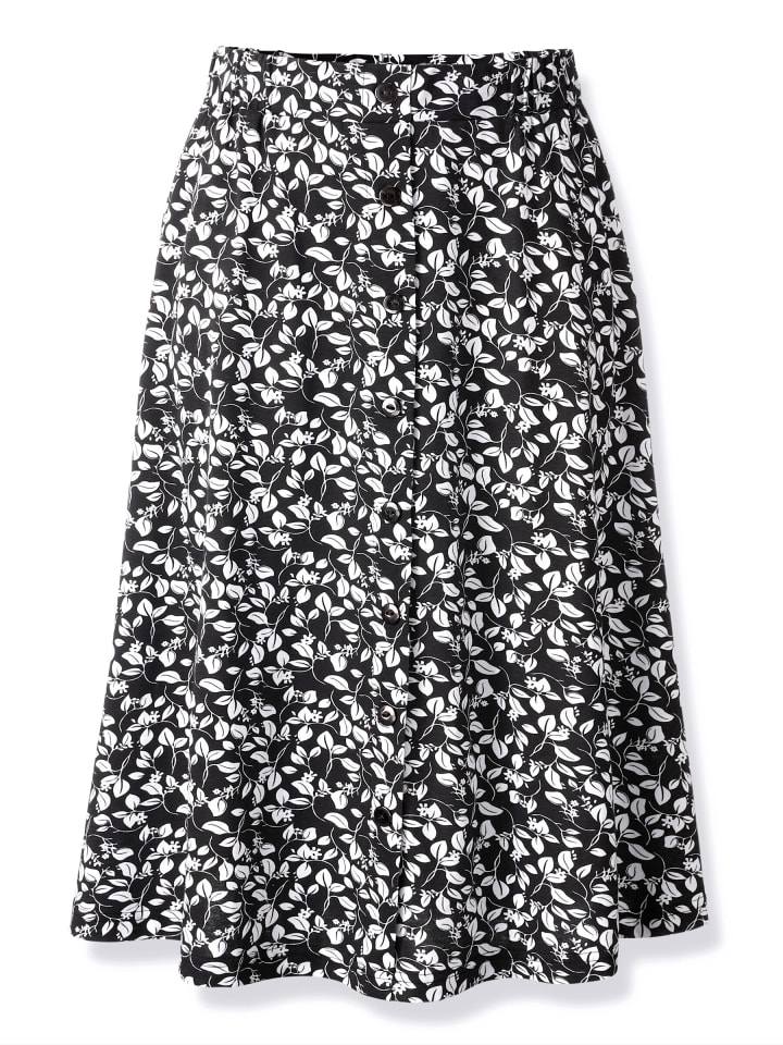 Юбка с цветочным принтом, удобным эластичным поясом и гладкой передней частью. Спереди - планка с имитацией пуговиц по всей длине. Сертифицировано GOTS.