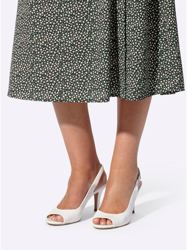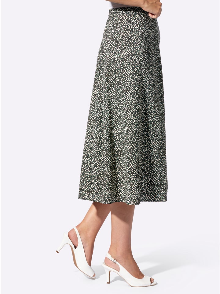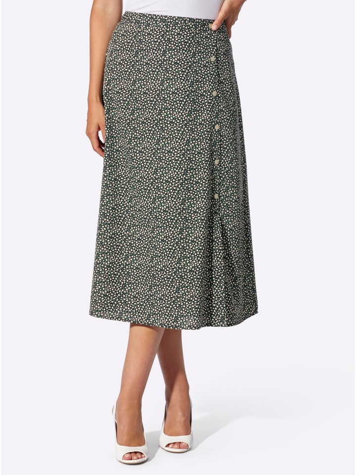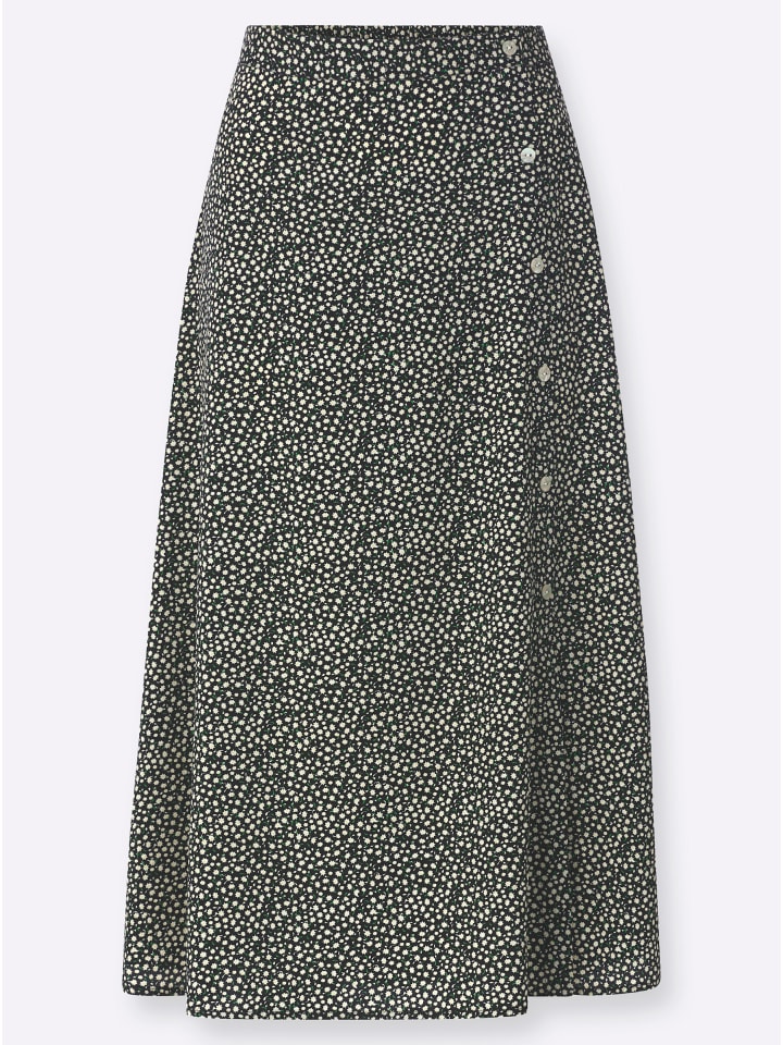 Из прочного крепа, не требующего особого ухода: удобная юбка без застежек, с эластичным поясом сзади. Свободный силуэт с декоративной планкой на пуговицах сбоку и потайной шлице спереди.