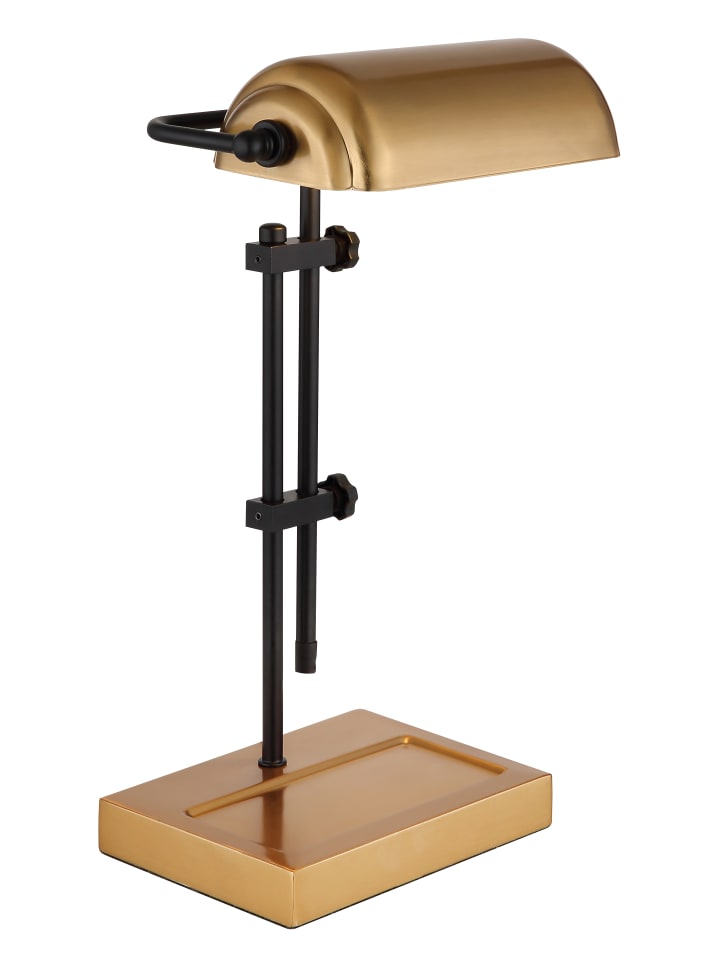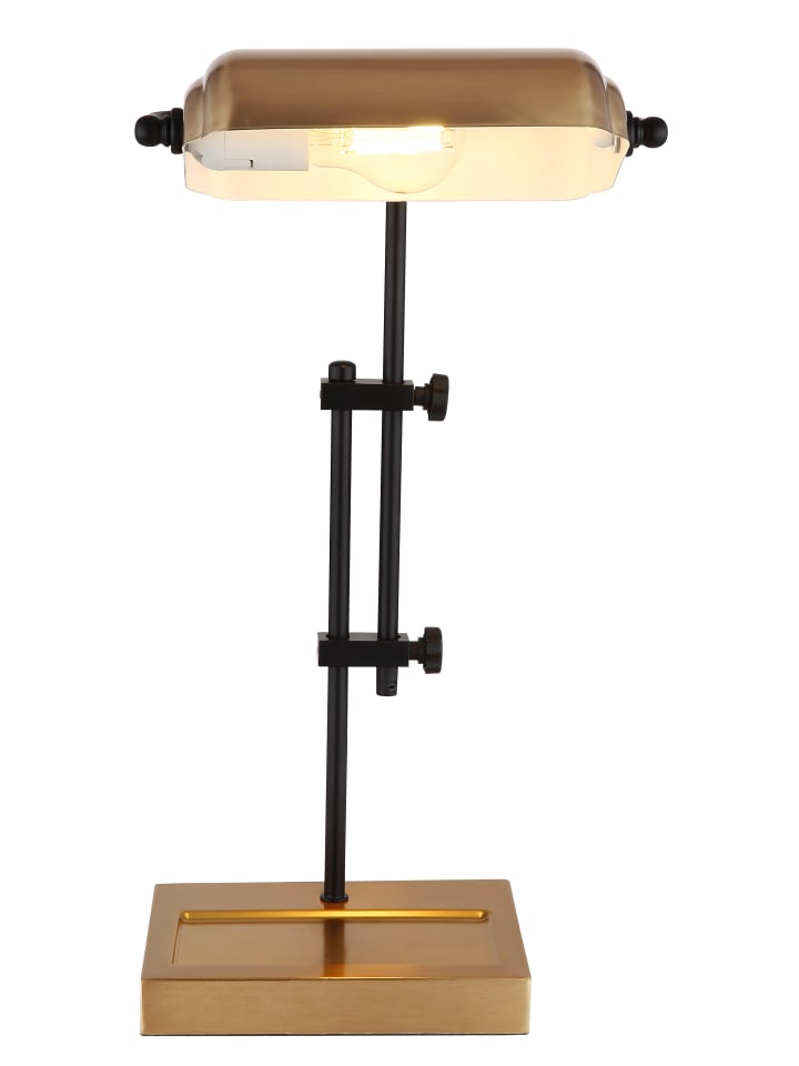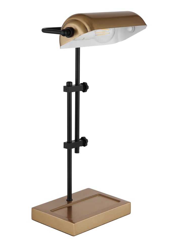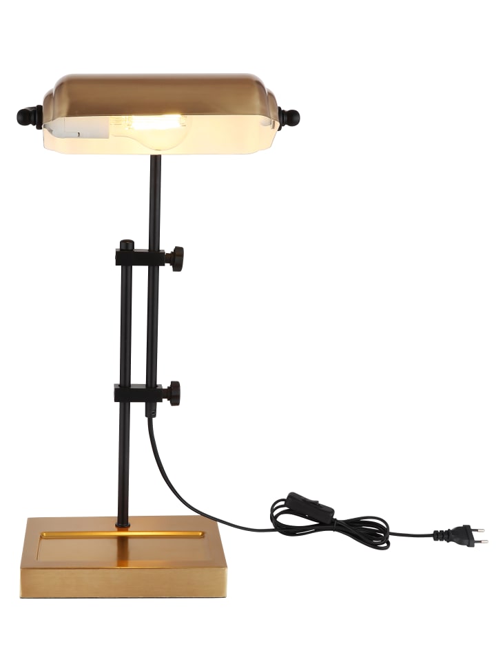 Настольная лампа, матово-черный металл, металл цвета античного золота, металл цвета античного золота, белый цвет, черный кабель из ПВХ, клавишный выключатель на кабеле, регулируемая высота, ДxШxВ: 265x182x500 мм, длина кабеля 1500 мм, регулируемая высота от 39 до 50 см, без 1 лампы E27 60 Вт 230 В