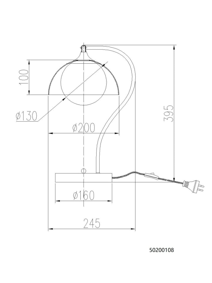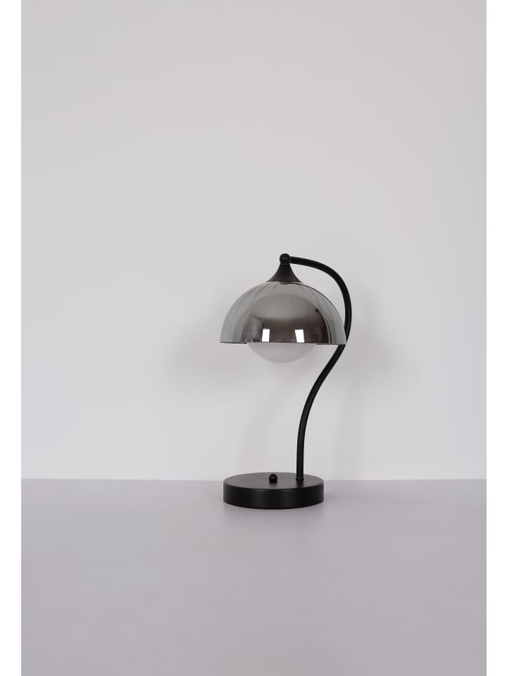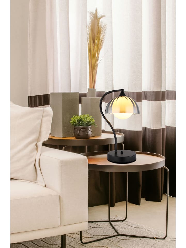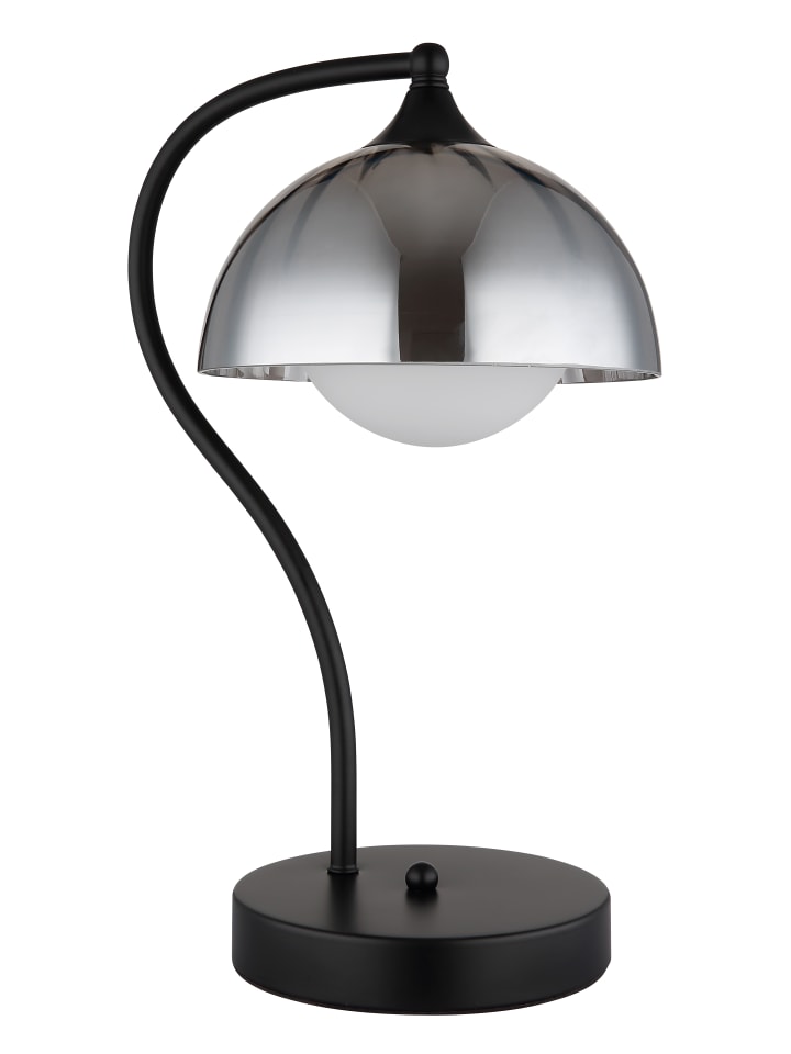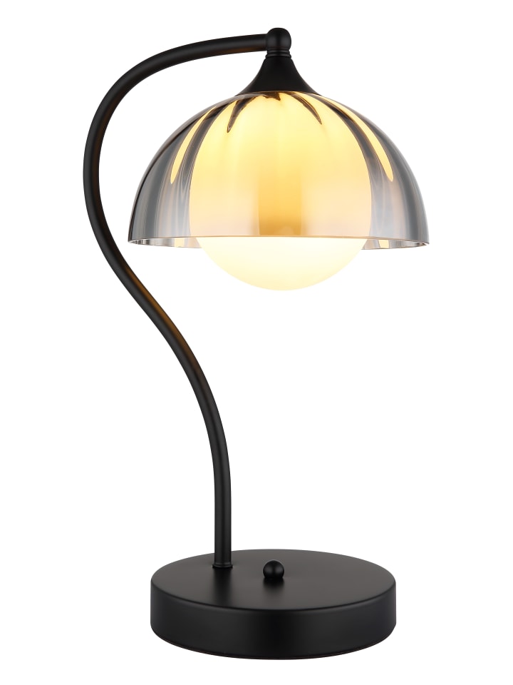 Настольная лампа, матовый черный металл, дымчатое стекло, опаловый стеклянный плафон, черный кабель из ПВХ, клавишный выключатель на кабеле, Д x Ш x В: 245 x 200 x 395 мм, длина кабеля 1750 мм, внутренний диаметр стекла: 13 см, без 1 светодиода G9 10 Вт 230 В
