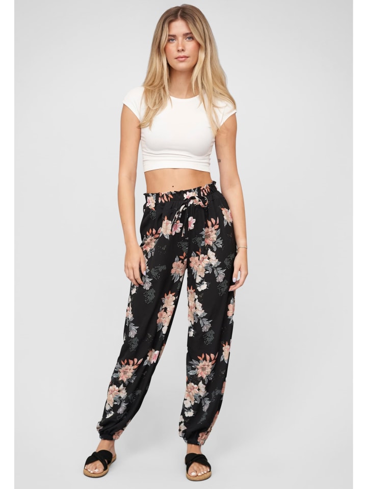 Брюки с цветочным принтом по всей поверхности идеально подходят в качестве повседневного слоя одежды. Свободный крой, широкие штанины и высокая талия. Легкий полиэстер с эластаном мягко драпируется и обеспечивает свободу движений, а пояс на шнурке обеспечивает индивидуальную посадку и подчеркивает высокий вырез. Широкие штанины плавно переходят в эластичные манжеты на щиколотках, создавая современный, слегка присборенный вид и одновременно структурируя широкую драпировку. Такие тонкие детали, как подчеркивающая фигуру высокая талия и плавный крой, делают эти брюки достаточно универсальными для расслабленных выходных или простых повседневных образов.