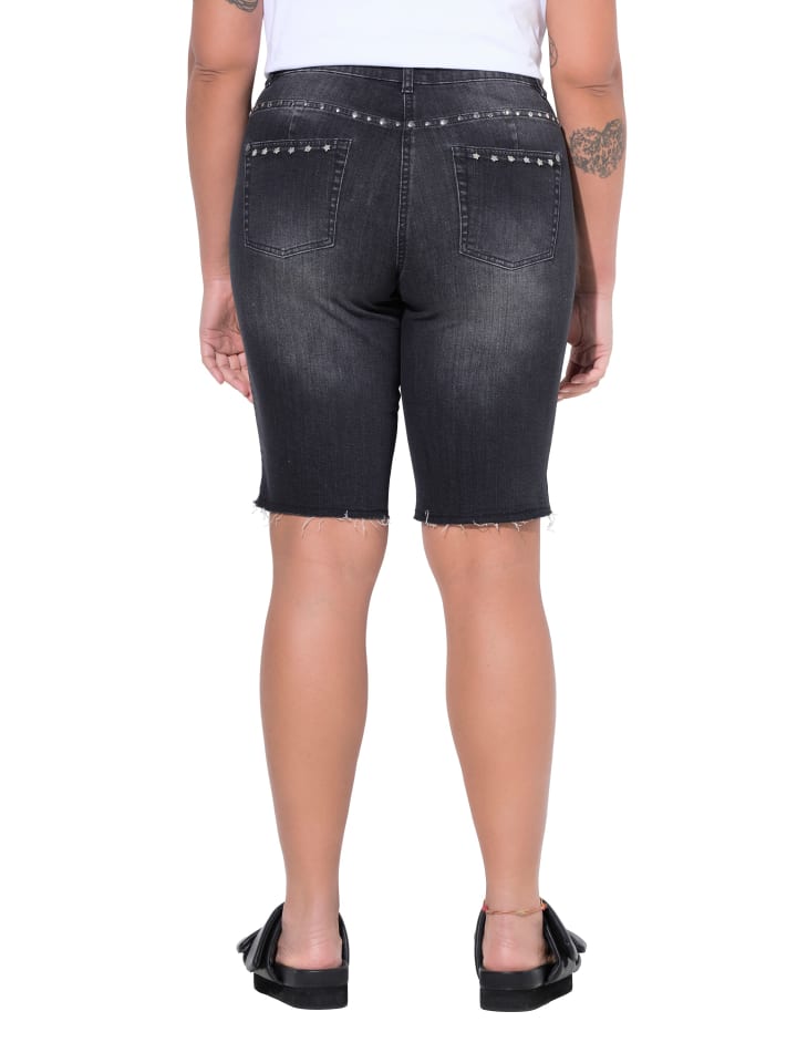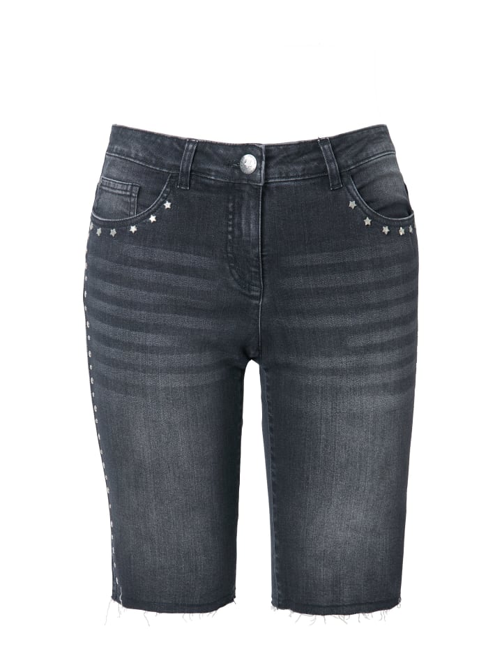 Джинсовые шорты-бермуды, прямого кроя, с декоративными заклепками и срезанным краем. Модель с пятью карманами, пояс со шлевками для ремня, застежка на пуговицу и молнию.