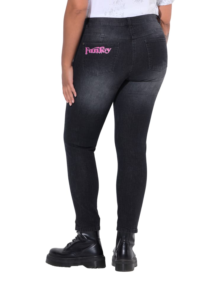Джинсы Emma, облегающего кроя, из эластичного денима с принтами. 5 карманов, пояс со шлевками для ремня, застежка на пуговицу и молнию.
