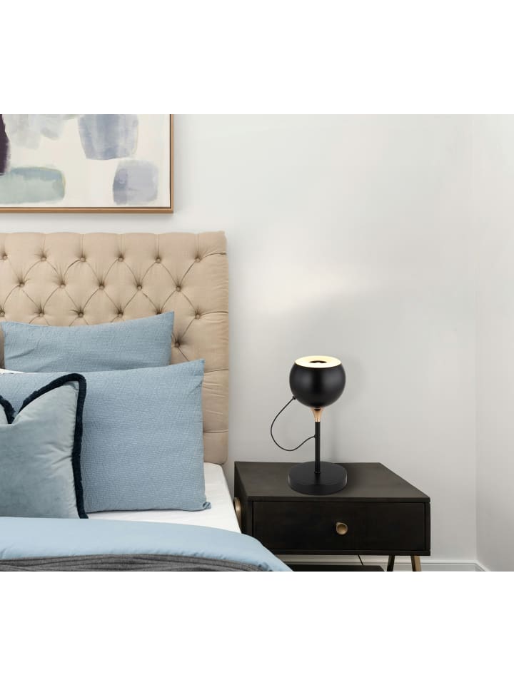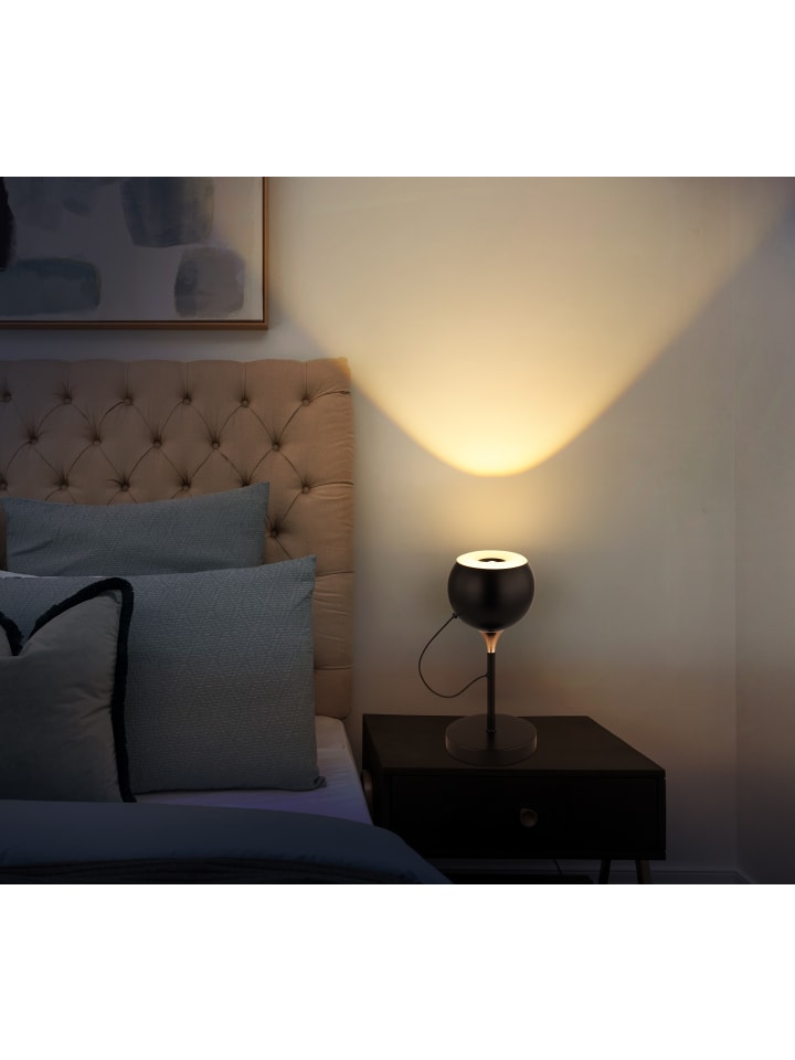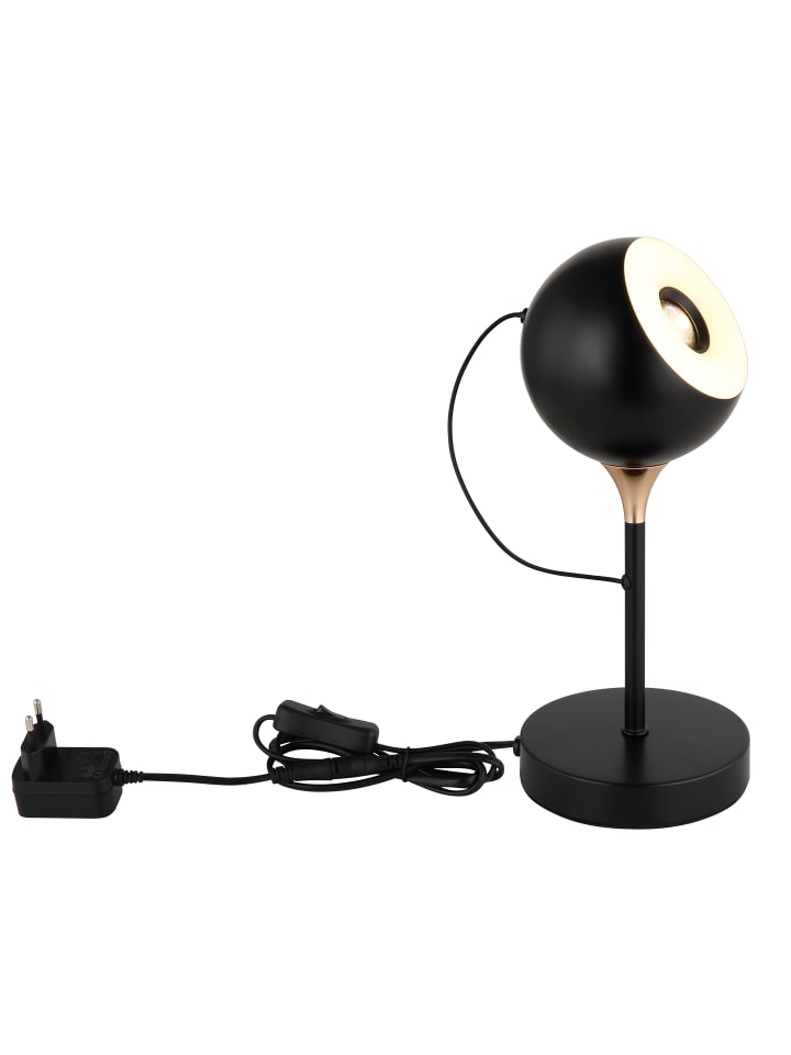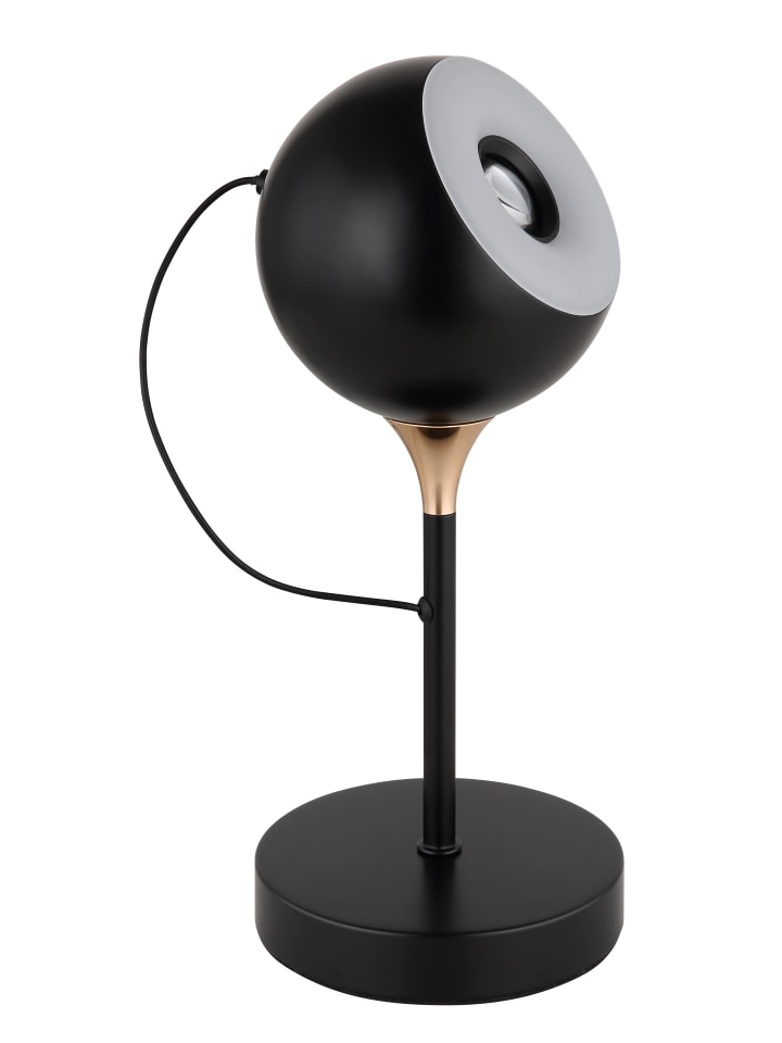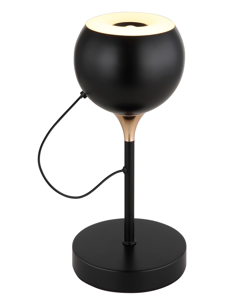 Настольная лампа, металл матово-черного цвета, металл с черным хромом, металл с золотым покрытием, опаловый акрил, черный кабель из ПВХ, клавишный выключатель на кабеле, регулируемый абажур на магнитах, диаметр: 130 мм, высота: 285 мм, длина кабеля: 1500 мм, в комплекте светодиод 10 Вт 230 В, источник света: 1022 лм, световой поток: 485 лм, цветовая температура: 3000 К