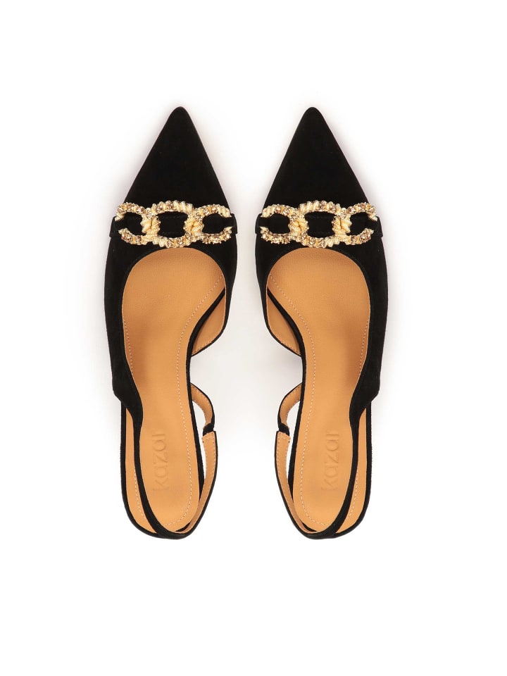 Эти классические туфли-лодочки с открытой пяткой и острым носком выглядят на ноге очень стильно и шикарно. Туфли изготовлены из высококачественной замши, которая отличается прочностью, эластичностью и элегантным внешним видом. Высокий каблук обеспечивает устойчивость и значительно повышает комфорт при ходьбе благодаря идеальному балансу и профилю. Оригинальное украшение в виде толстой цепочки добавляет нотку роскоши. Черные туфли-лодочки - вневременной аксессуар не только для вечерних и повседневных нарядов, но и для менее официальных случаев.