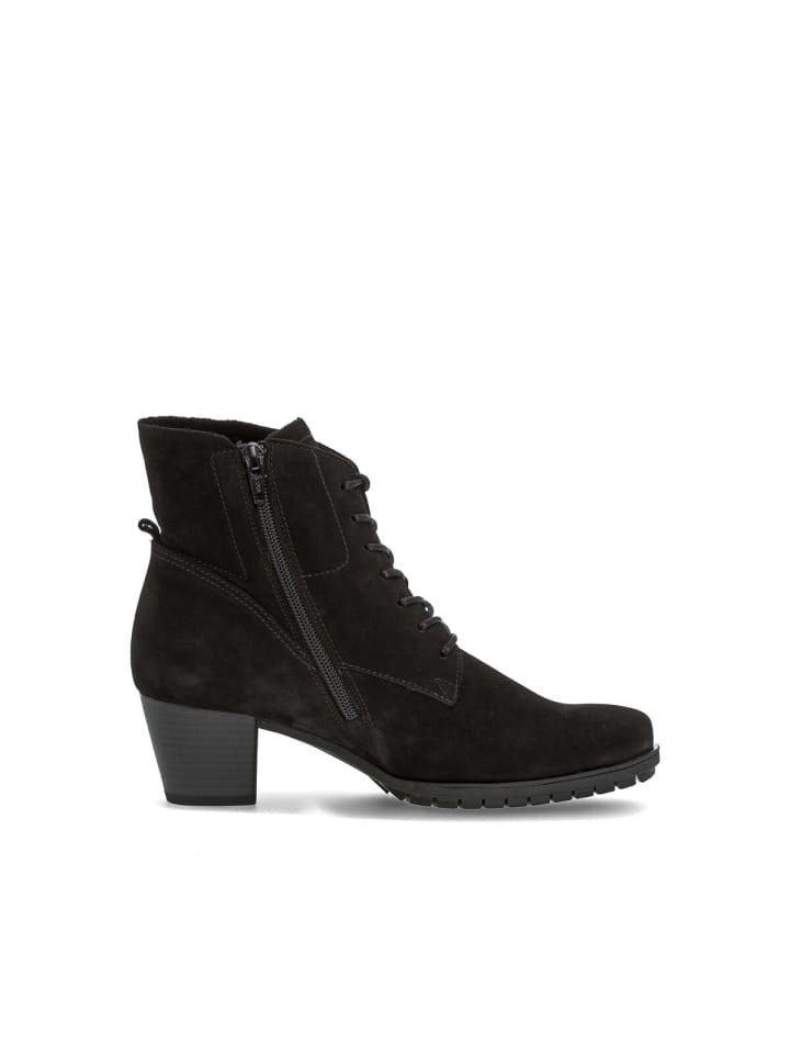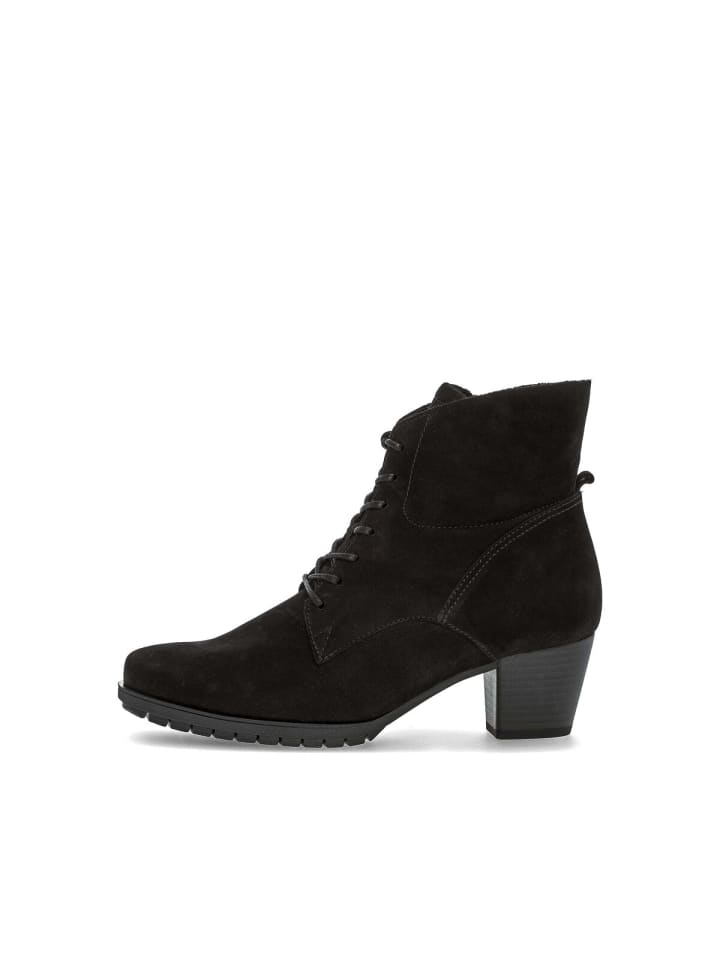 Ботинки Gabor на шнуровке - абсолютный маст-хэв для модниц. Причина: их можно комбинировать по-разному, и они особенно популярны в межсезонье. Высококачественный верх черного цвета из текстурированной замши придает ботильонам непринужденный вид. Ширина H (широкая) означает, что ботильоны идеально подойдут женщинам с более широкой стопой. Ботильоны комфортной линии имеют больший объем в области подушечки и подъема, а также больше места для пальцев, обеспечивая устойчивость стопы.