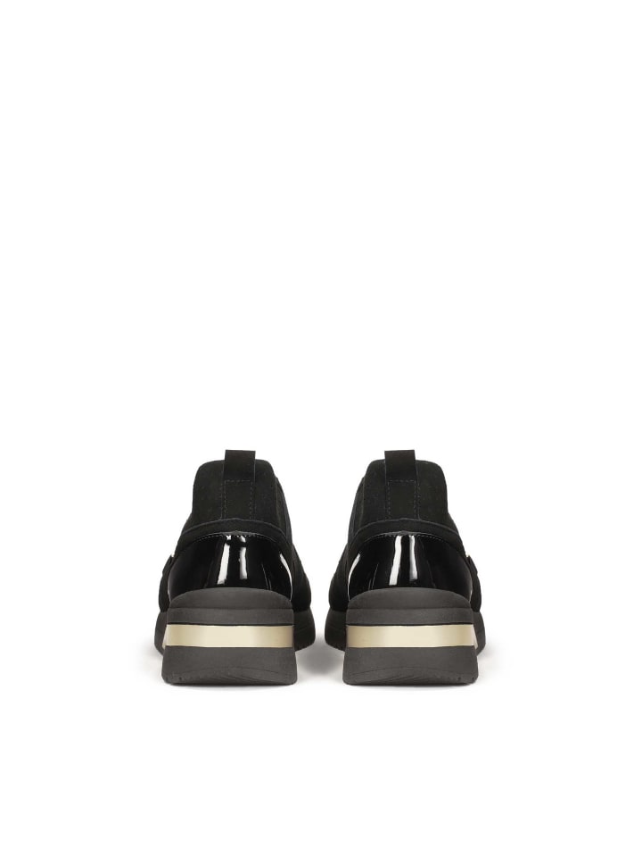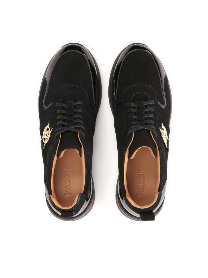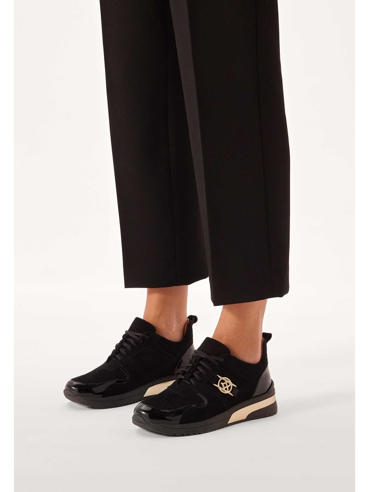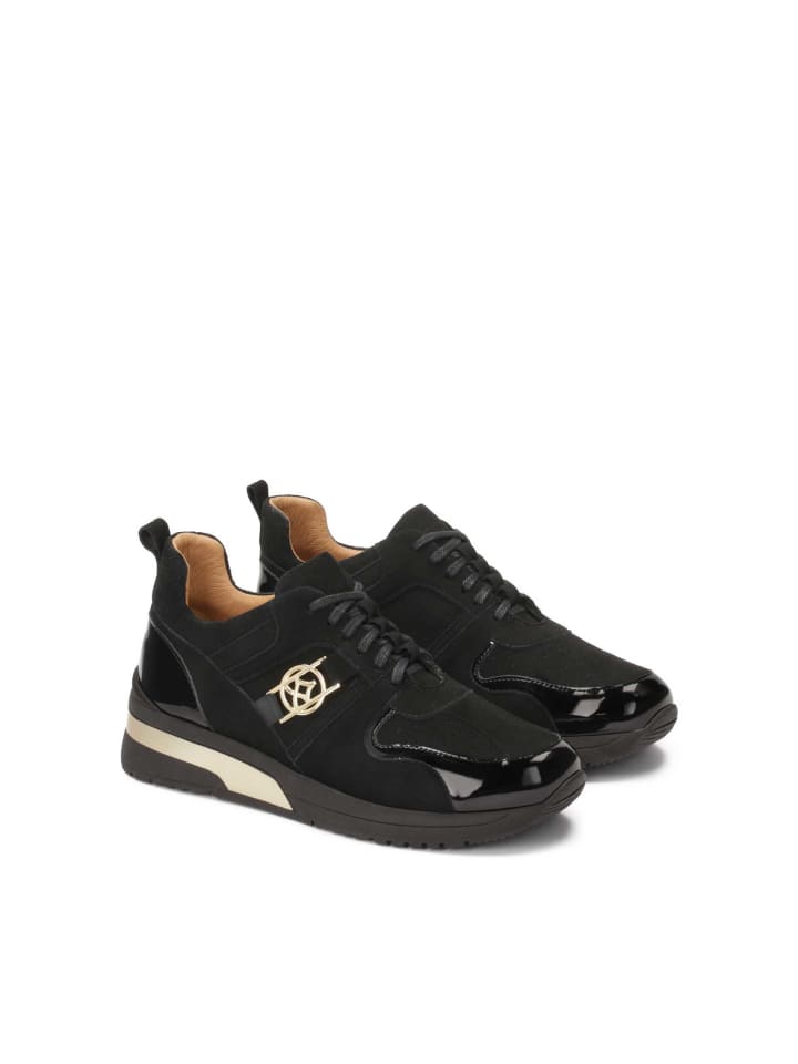 Эти черные кроссовки из замши и лакированной кожи отличаются элегантным верхом на шнуровке и приподнятой подошвой. Классический черный дизайн дополнен эффектными золотыми деталями. Эти повседневные кроссовки идеально дополнят ваш повседневный образ. Они идеально сочетаются как со спортивным костюмом для работы, так и с спортивным костюмом для прогулок.