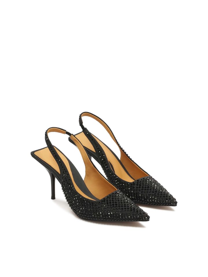 Вечерние туфли с открытой пяткой порадуют любительниц гламурного стиля. Острый носок украшен маленькими черными кристаллами, которые красиво мерцают на свету. Открытый каблук с квадратным носком, выполненный из ткани с изысканной отделкой, добавляет ноге интересный штрих. Эти элегантные туфли будут эффектно смотреться в сочетании с шикарным платьем.