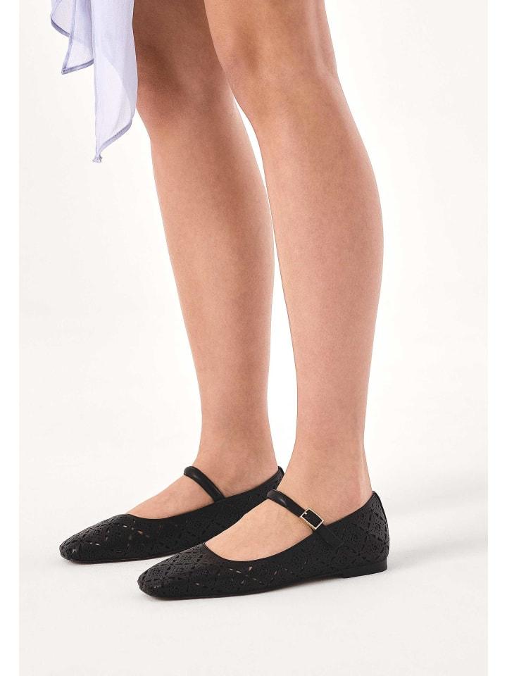 Черные туфли из высококачественной натуральной кожи отличаются исключительно элегантным внешним видом, подчеркнутым тонкими деталями. Верх украшен тонким ажурным узором, придающим модели изящество и изысканный стиль. Этот узор состоит из сложных симметричных мотивов, напоминающих мелкие геометрические фигуры, образующих повторяющуюся, гармоничную композицию. Благодаря этому украшению туфли не только привлекают внимание, но и обеспечивают лучшую воздухопроницаемость, повышая комфорт при ношении. Ремешок на подъеме с декоративной металлической пряжкой обеспечивает функциональность и стильный ретро-нотку, идеально дополняя ажурный верх.