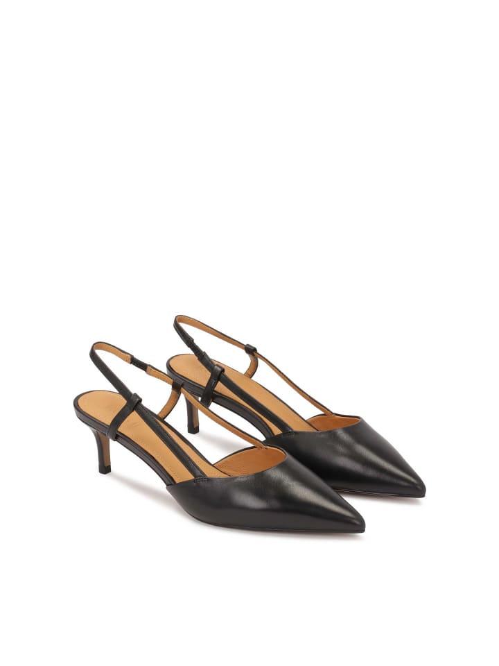 Черные туфли-лодочки из высококачественной натуральной кожи - элегантная и сдержанная обувь, идеально подходящая для самых разных случаев. Верх с вырезами придает общему дизайну легкость и изящество. Ремешок на пятке с эластичной резинкой обеспечивает комфорт и устойчивость. Низкий, удобный каблук делает их идеальным выбором для долгих дней, когда вам необходимо сочетание элегантности и комфорта. Удлиненный, заостренный носок добавляет шика, визуально удлиняя ногу и придавая им классический, изысканный вид.
