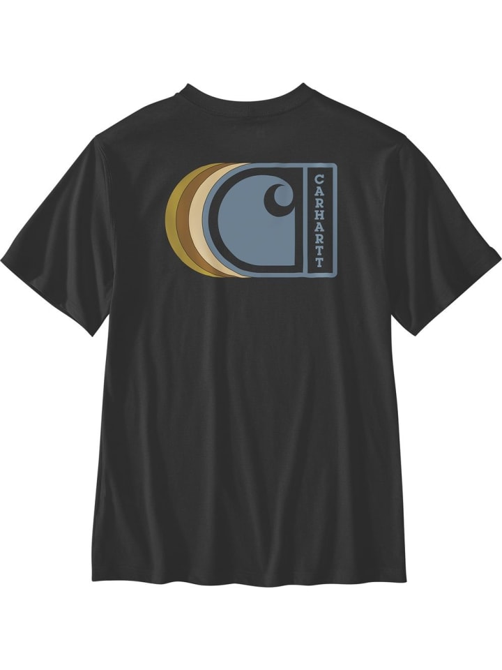 Свободный крой · 5 унций/ярд² - 170 г/м² · 60% хлопок/40% полиэстер · Легкий хлопковый джерси/полиэстер Vortex · Короткие рукава · Ребристый круглый вырез · Плоский двухигольный плоский шов · Рисунок Carhartt «C» на спине