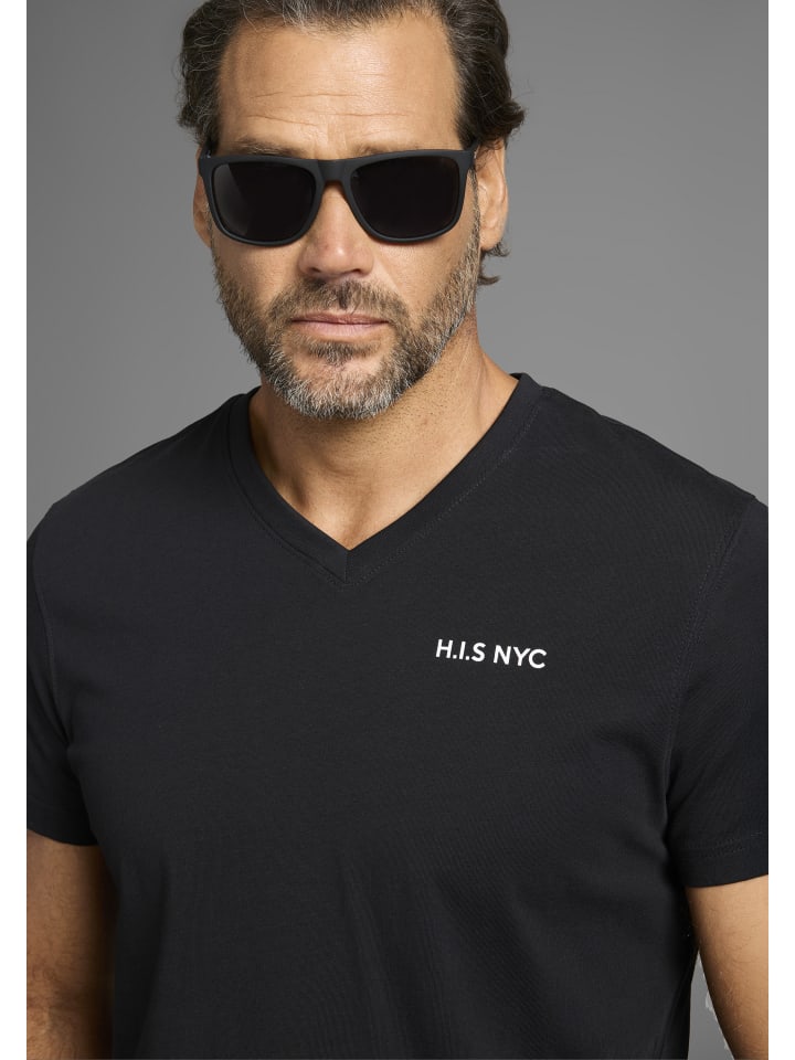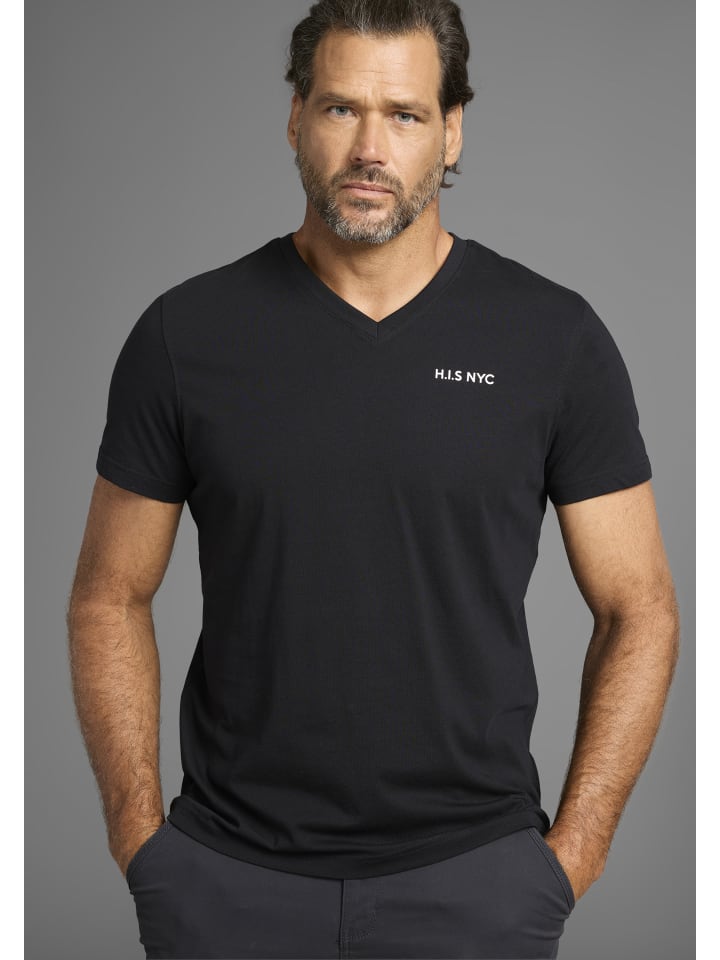 Универсальная мужская футболка с V-образным вырезом от HIS. Свободный крой, короткие рукава и стильный принт с логотипом. Футболка из мягкого трикотажного полотна обеспечивает комфорт при ношении.