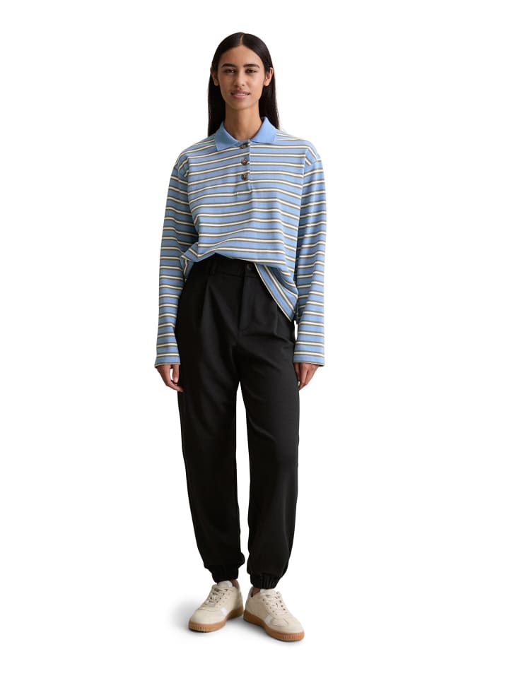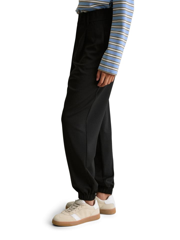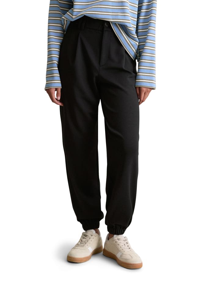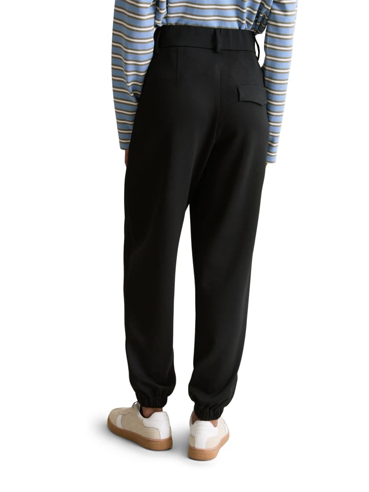 Стильные, спортивные и элегантные: эти повседневные зауженные брюки в стиле джоггеров. Модель Marc O'Polo DENIM с широкой талией на резинке, карманами в боковых швах, застежкой на пуговицу и молнию, а также задним карманом. Тонкая, струящаяся трикотажная ткань с высоким содержанием модала имеет нежную текстуру. Присборенный пояс, свободные укороченные штанины с эластичным краем. Сочетайте их с подходящим блейзером и лаконичной блузкой для создания современного офисного образа.