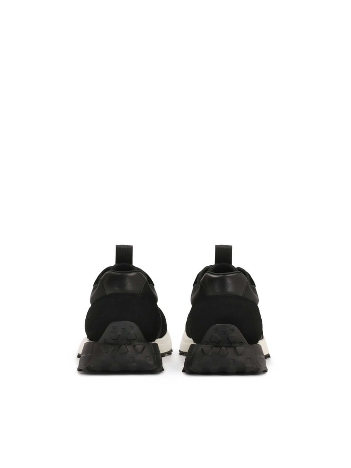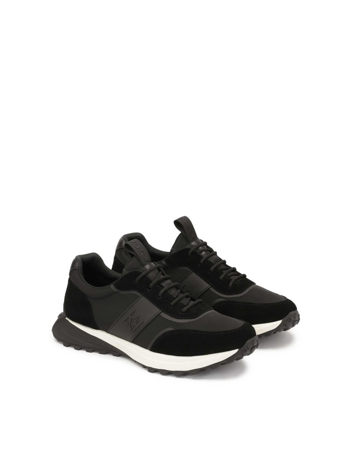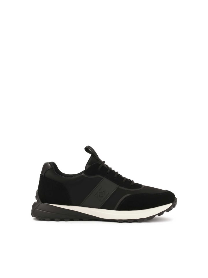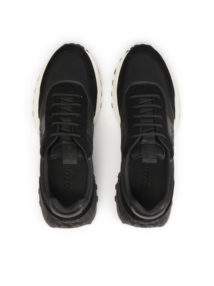 Эти черные кроссовки из высококачественной замши и синтетических материалов - стильный выбор для мужчин, которые ценят современный дизайн и комфорт. Шнуровка придает обуви классический спортивный вид, а монограмма сбоку подчеркивает фирменный стиль бренда. Контрастная черно-белая подошва обеспечивает четкость и отличное сцепление, дополняя элегантность темного верха. Декоративный бант на язычке с логотипом KAZAR добавляет оригинальности и модного штриха. Идеально подходят для повседневных и спортивных образов с ноткой изысканности.