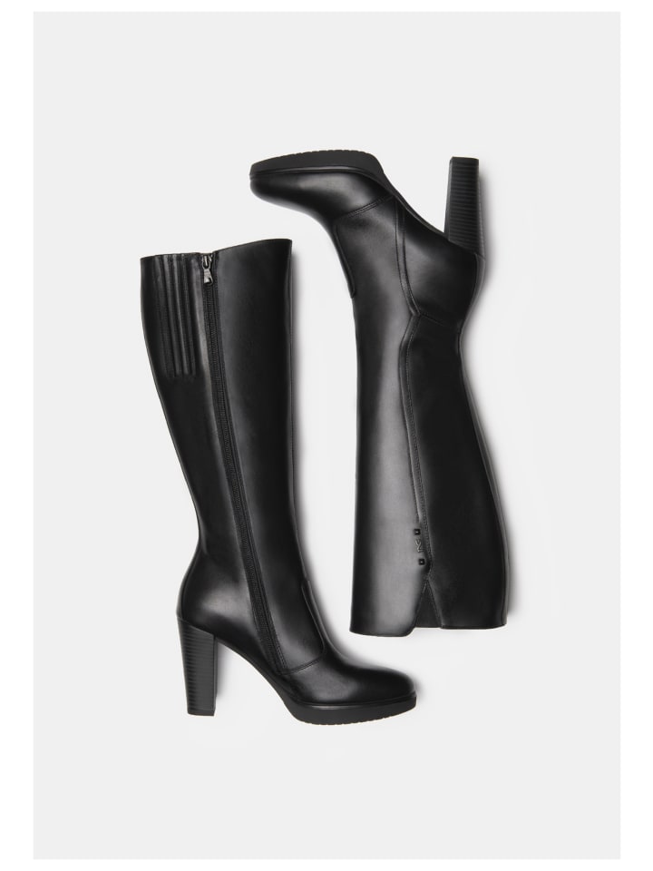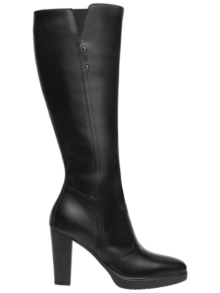 Элегантные высокие сапоги из тонкой гладкой кожи с изящной декоративной строчкой и заклепками на голенище. Узкий силуэт и высокий блочный каблук придают обуви женственность.