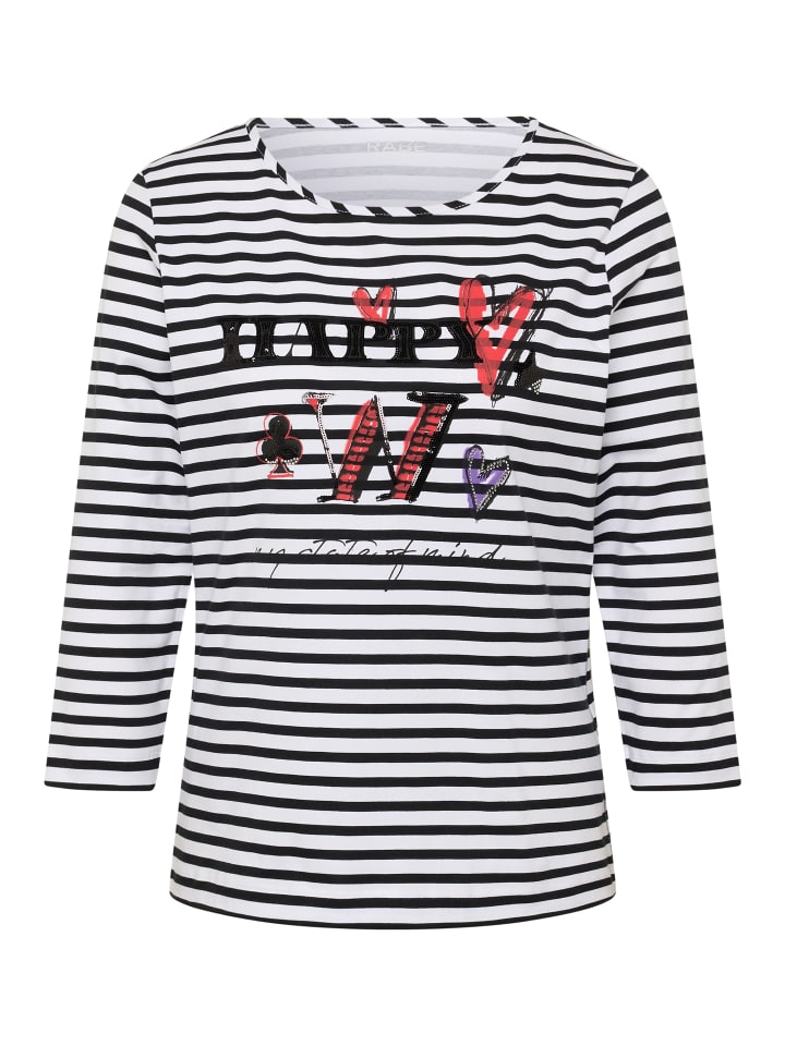 Эта рубашка сочетает в себе классический полосатый дизайн с игривым принтом спереди и декоративными акцентами. Круглый вырез. Рукава 3/4. Узор с надписью и мерцающими деталями. Удобная посадка. Мягкий трикотаж.