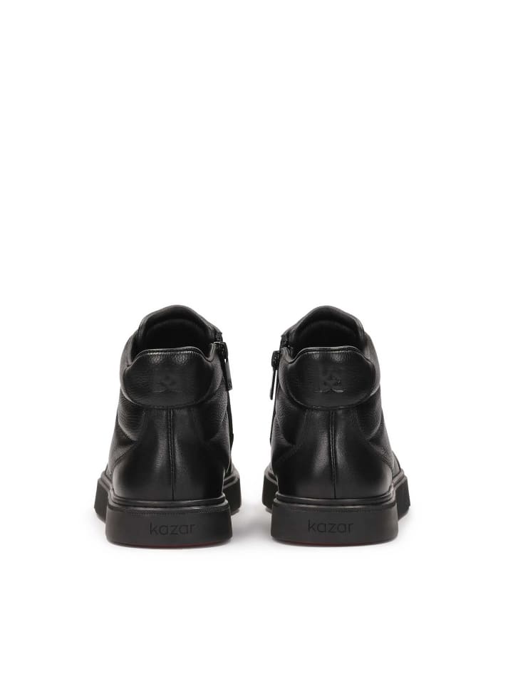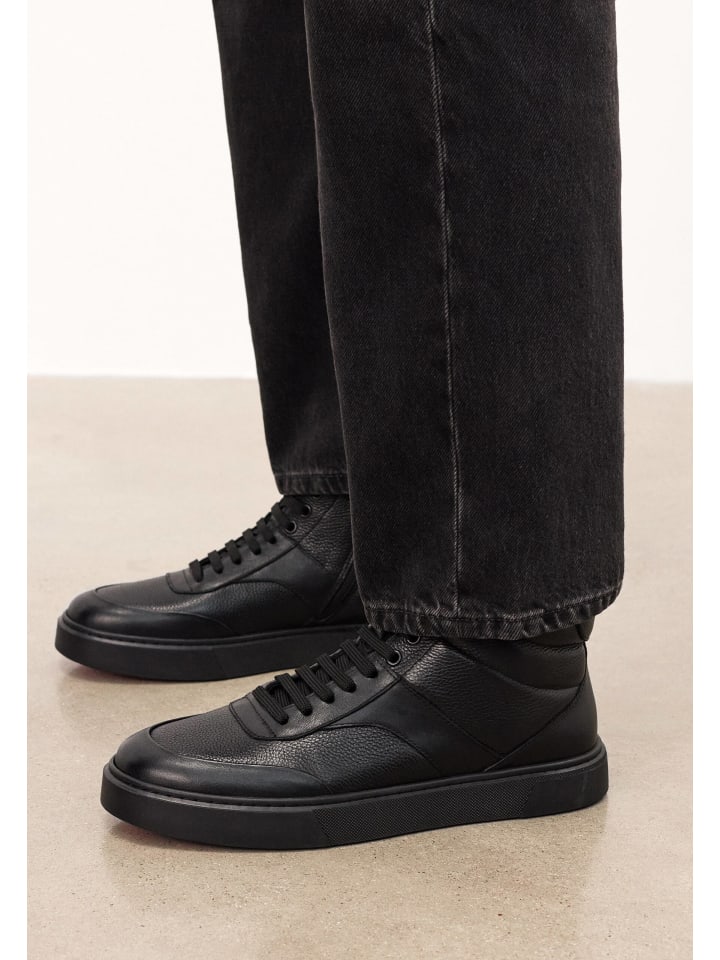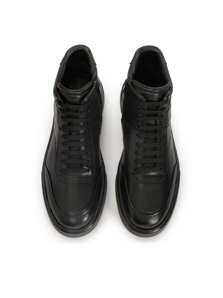 Современные, но неподвластные времени черные кроссовки из высококачественной натуральной кожи - идеальный выбор для мужчин, которые ценят стиль, комфорт и качество. Высокий верх обеспечивает отличную поддержку лодыжки, а классическая шнуровка позволяет регулировать посадку. Различные фактуры кожи - от гладкой до едва заметно тисненой - придают кроссовкам динамичный городской характер. Ярким акцентом является контрастная красная подошва, которая добавляет индивидуальности и современного стиля, не жертвуя универсальностью. Они подойдут как для повседневного образа, так и для изысканных повседневных образов: кроссовки, сочетающие в себе модный вид и повседневную практичность.