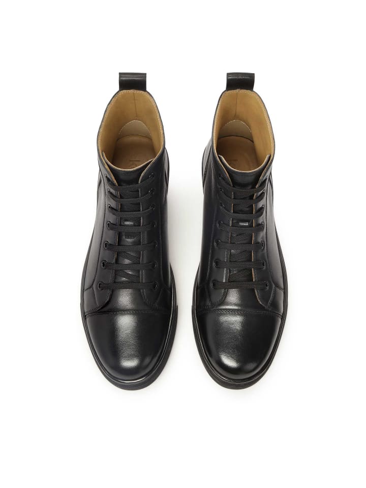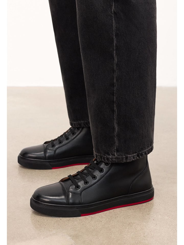Черные кроссовки из высококачественной натуральной кожи созданы для ценителей минималистичного стиля. Эта модель высотой до щиколотки отличается гладким высоким дизайном и простой формой - без украшений, швов и тиснения, что подчеркивает ее современную, сдержанную эстетику. Классическая шнуровка обеспечивает хорошую посадку и комфорт. Кроссовки стоят на простой, прочной подошве с эффектной деталью - красной вставкой, которая разбавляет монохромный образ и добавляет нотку ясности. Эта модель - идеальный выбор для мужчин, которые ценят высокое качество изготовления, четкий дизайн и изящные дизайнерские акценты.