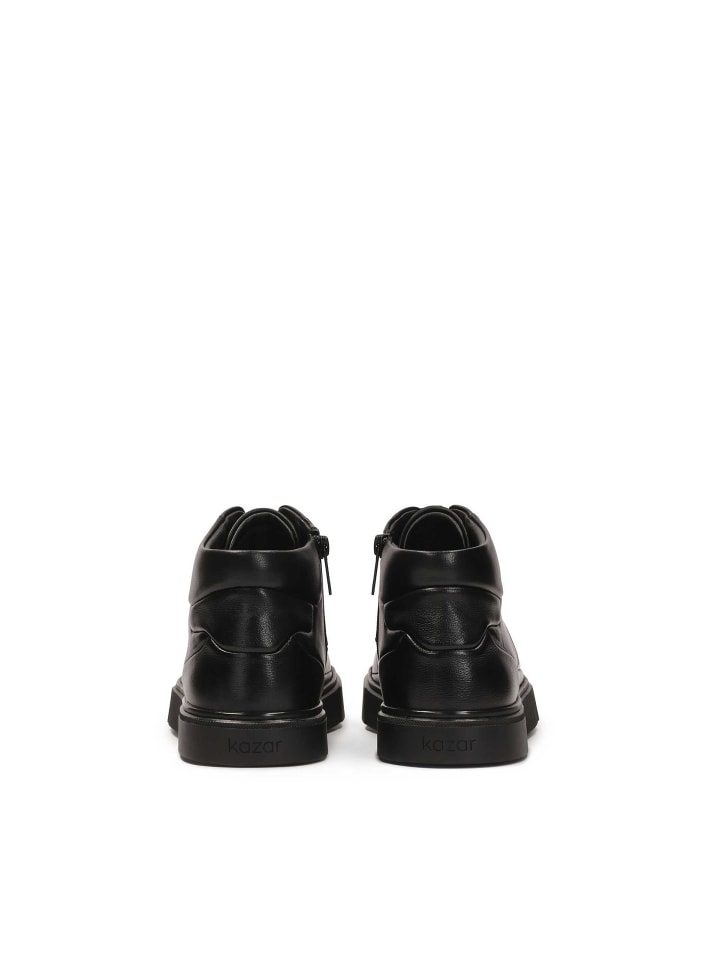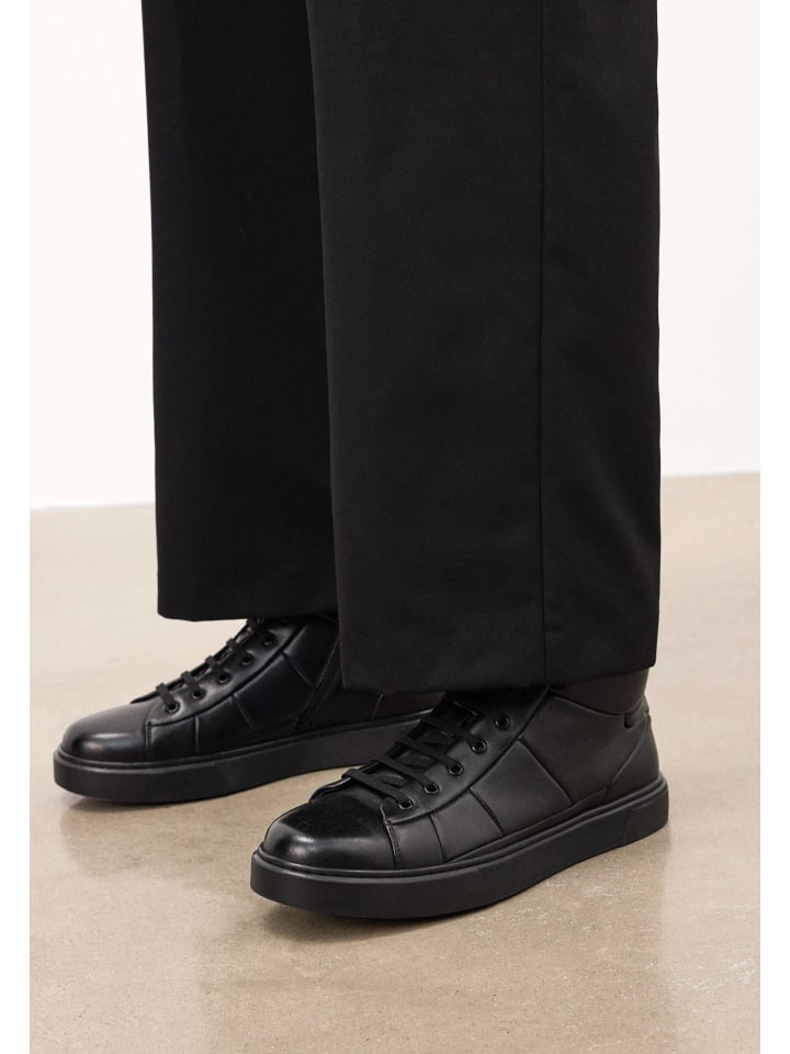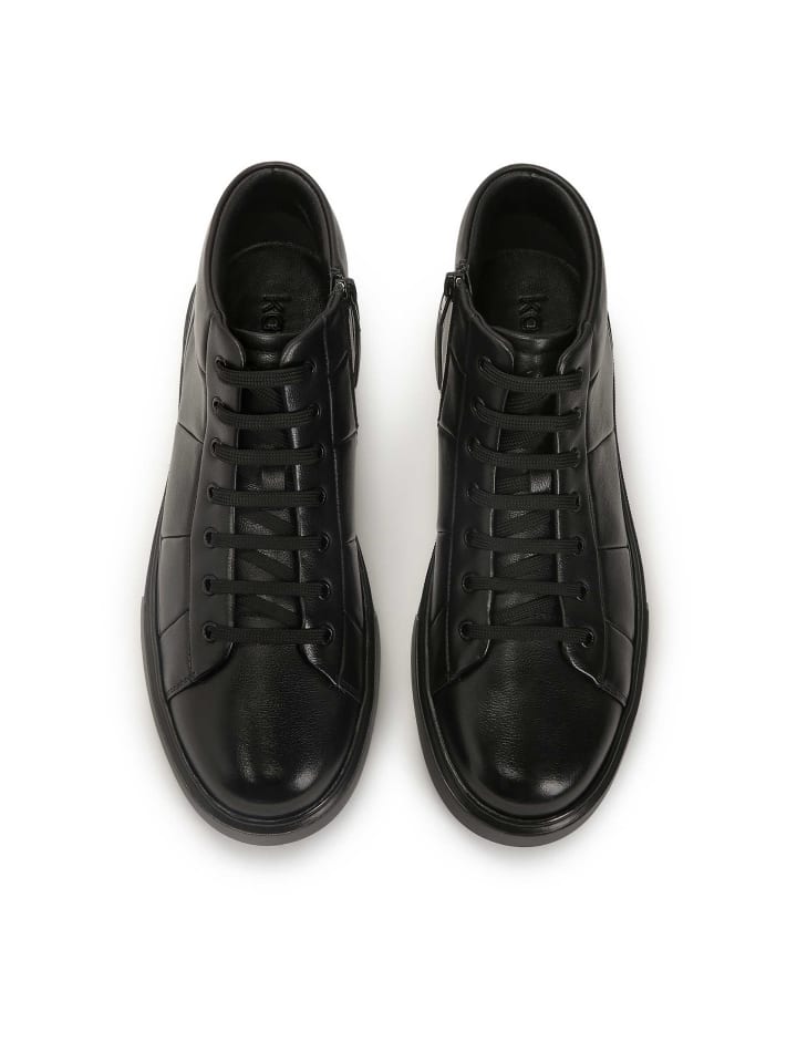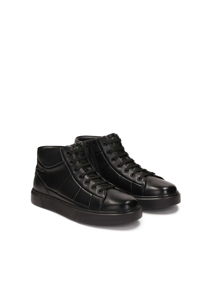 Черные кроссовки из высококачественной натуральной кожи, сочетающие минималистичный стиль с ярко выраженным современным дизайном. Модель высотой до щиколотки имеет верх с геометрической строчкой, что придает ей динамичный и дизайнерский характер. Сочетание классической шнуровки и практичной молнии на внутренней стороне голенища обеспечивает легкое надевание и снятие, а также идеальную посадку. Легкий блеск кожи подчеркивает качество материала, а прочная, однородная подошва обеспечивает городской стиль и устойчивость. Обувь для мужчин, которые ценят изысканные детали, комфорт и современную эстетику в повседневной жизни.
