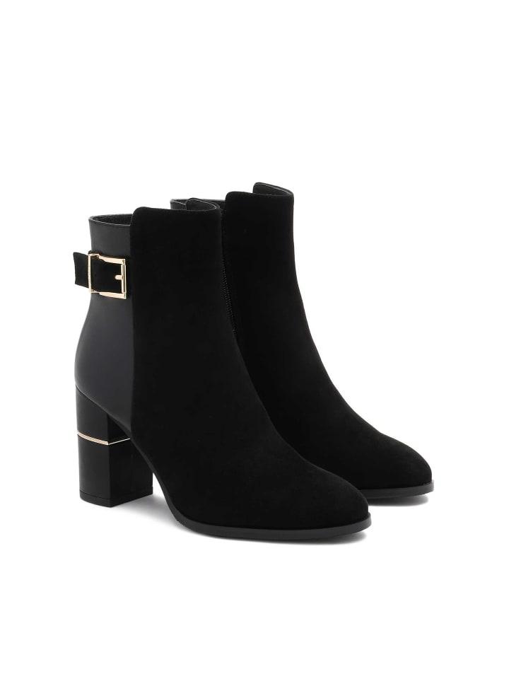 Уникальные сапоги, впечатляющие контрастным сочетанием фактур и роскошных акцентов. Дизайн сочетает гладкую натуральную кожу на задней части голенища с мягкой бархатистой замшей на передней части, создавая эффектную игру текстур. Выполненные в классическом черном цвете, они источают вневременную элегантность, а изящные детали добавляют нотку современности. Широкий устойчивый каблук-шпилька гарантирует комфорт в течение всего дня, а золотая вставка у основания каблука придает туфлям нотку гламура и эксклюзивный вид. Декоративный ремешок с металлической пряжкой подчеркивает изысканный дизайн и мягко подчеркивает линии верха. Сапоги оснащены практичной застежкой-молнией для легкого надевания и снимания, обеспечивая идеальную посадку. Закругленный носок обеспечивает комфорт и придает общему облику нотку утонченной классики.