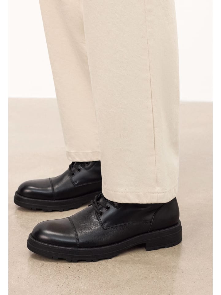 Черные ботильоны из натуральной кожи - прочный и стильный вариант для осенне-зимнего сезона. Верх сочетает в себе элементы гладкой глянцевой поверхности с деталями с текстурой гороха, что придает обуви современный характер и утонченную динамичность. Классическая шнуровка обеспечивает хорошую посадку, а утепленная подкладка гарантирует тепловой комфорт в холодные дни. Ботинки установлены на прочной черной подошве с выраженным протектором, что обеспечивает отличное сцепление и устойчивость. Практичные и универсальные - идеально подходят как для повседневной носки, так и для создания более непринужденного образа.