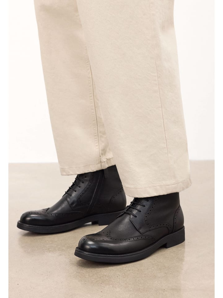 Стильные ботинки из высококачественной черной натуральной кожи, сочетающие классическую элегантность и повседневный комфорт. Высокий голенище, легкая текстурированная поверхность и декоративная ажурная отделка в стиле броги придают ботинкам вневременной характер. Внутренняя часть частично утеплена, обеспечивая тепло в холодные дни, не жертвуя при этом легкостью. Прочная подошва обеспечивает прочность и устойчивость, а классическая шнуровка обеспечивает идеальную посадку. Они являются универсальным выбором как для деловых, так и для повседневных образов - идеальная обувь для мужчины, который ценит высокое качество, комфорт и стильные детали.