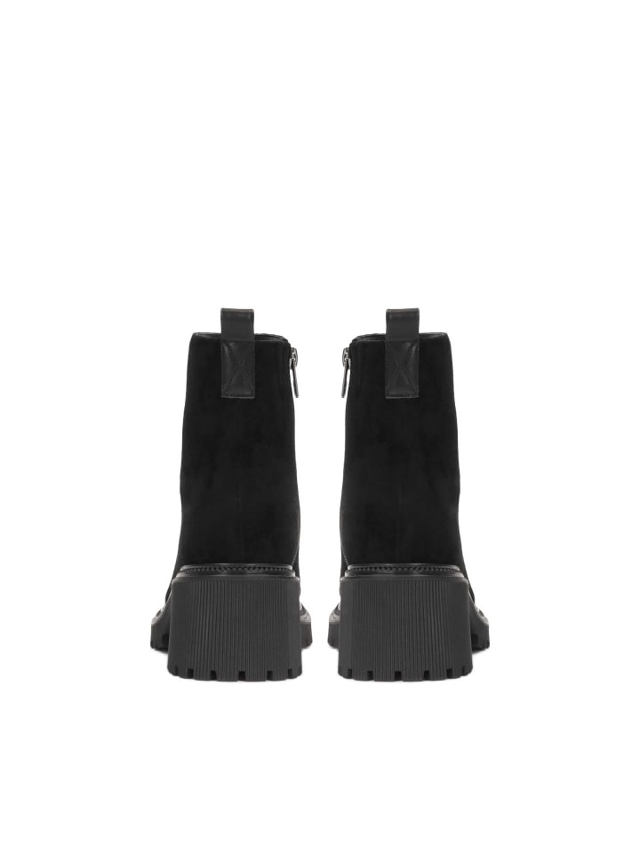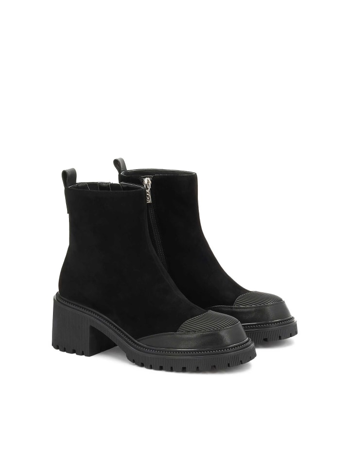 Черные ботинки из замши и гладкой кожи - современная и функциональная обувь. Верх на молнии обеспечивает удобную посадку, а контрастная гладкая кожаная вставка спереди придает ботинкам характерный вид. Усиленный резиновый носок повышает прочность и придает общему виду легкий индустриальный вид. Ботинки имеют рифленую подошву с широким блочным каблуком, что гарантирует устойчивость и комфорт. Дополнительный практичный элемент - язычок сзади голенища для легкого надевания. Идеальный выбор для тех, кто ценит модную и прочную повседневную обувь.