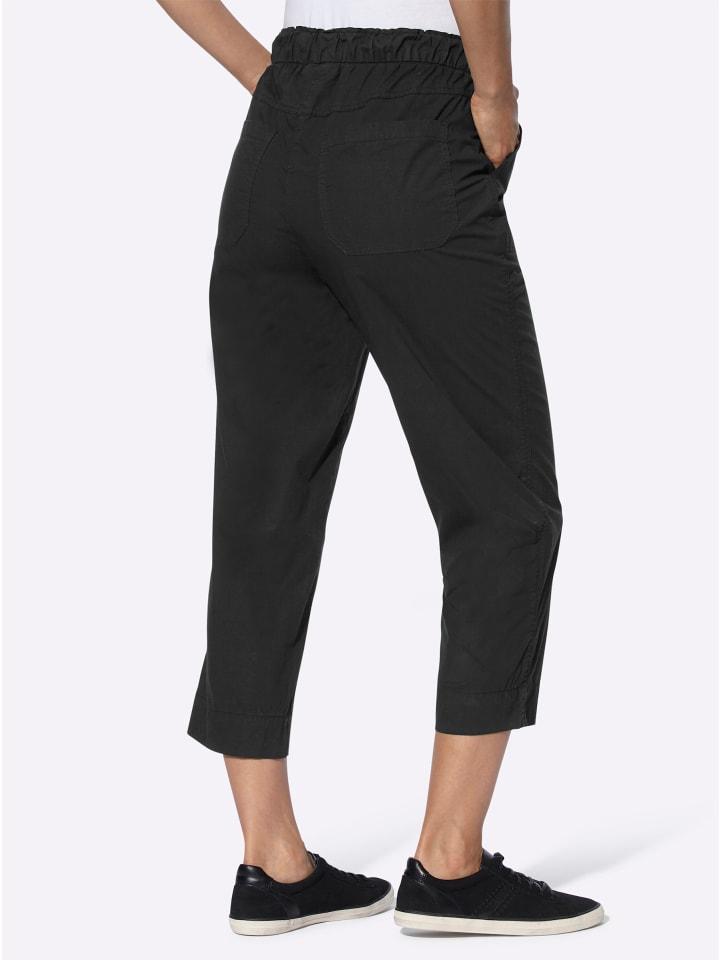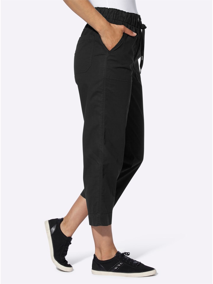 Наденьте их, и вы готовы к выходу: брюки 7/8 практичного фасона, которые легко надеваются, с присборенным по всему периметру эластичным поясом на кулиске. Приятный штрих: декоративная застежка на молнии. Два накладных кармана спереди и два квадратных кармана сзади. Слегка смещенный вперед боковой шов визуально удлиняет ногу. Длина брючины около 40 см. Соответствует инициативе «Хлопок, сделанный в Африке».