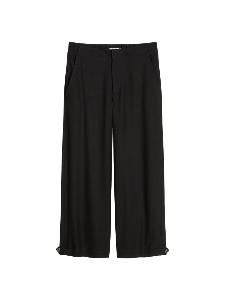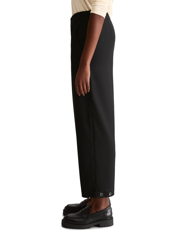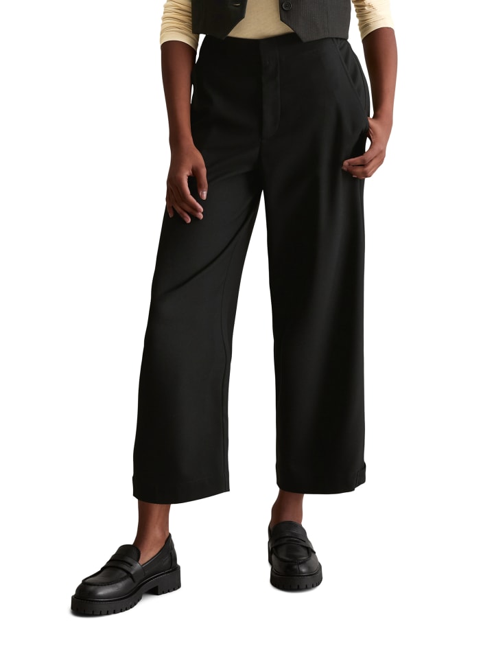 С помощью простого модного трюка силуэт этих брюк можно полностью преобразить благодаря регулируемому подолу: от широкого прямого до зауженного. Эти укороченные брюки свободного кроя от Marc O'Polo DENIM имеют свободный прямой крой с частично эластичным поясом и стандартной посадкой. Они изготовлены из высококачественной саржи из переработанного полиэстера и вискозы с едва заметной текстурой. Лаконичный вид достигается благодаря потайной застежке на молнию и крючок, косым передним карманам и одному прорезному карману сзади.