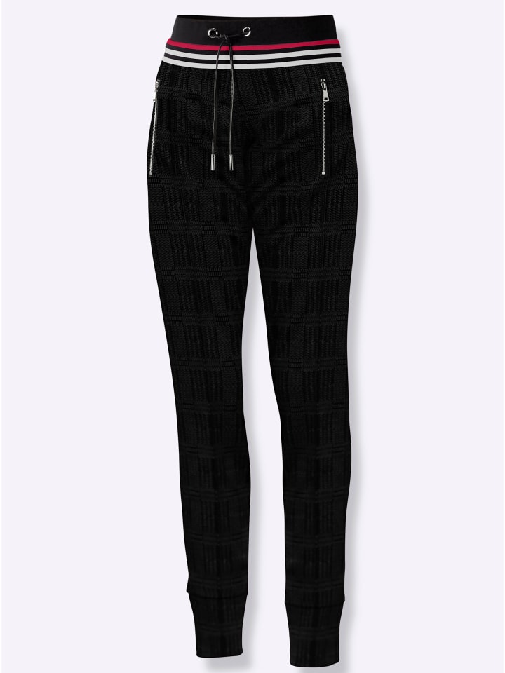 Вы просто обязаны их иметь! Трикотажные брюки в стиле casual jogger с контрастным полосатым поясом на резинке, кулиской и завязкой. Два боковых кармана с удлиненными молниями. Отстроченные складки и смещенные вперед боковые швы визуально удлиняют фигуру. Длина до щиколотки, модная высокая манжета. Ширина брючины около 30 см.
