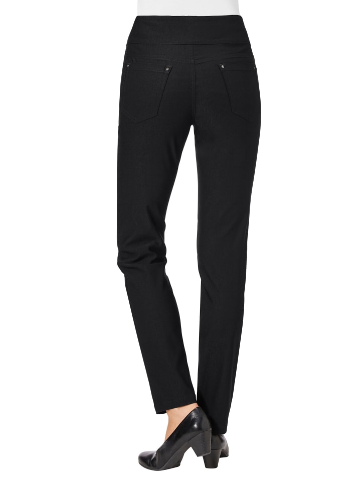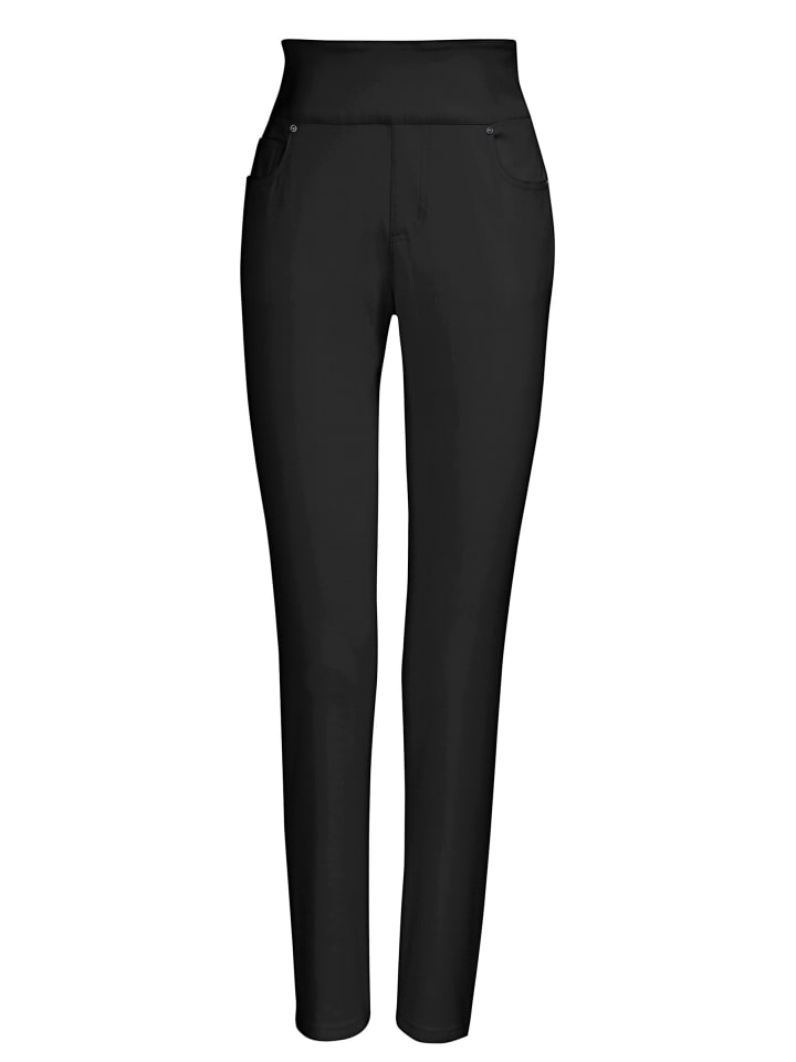 Слегка завышенный пояс обеспечивает оптимальную посадку и скрывает лишний вес в области бедер и живота! Брюки с имитацией застежки спереди. Два кармана и один карман для монет, а также два кармана сзади. Кокетка сзади. Изготовлены из мягкой, эластичной ткани «бенгалин». Длина брючины примерно 36 см.
