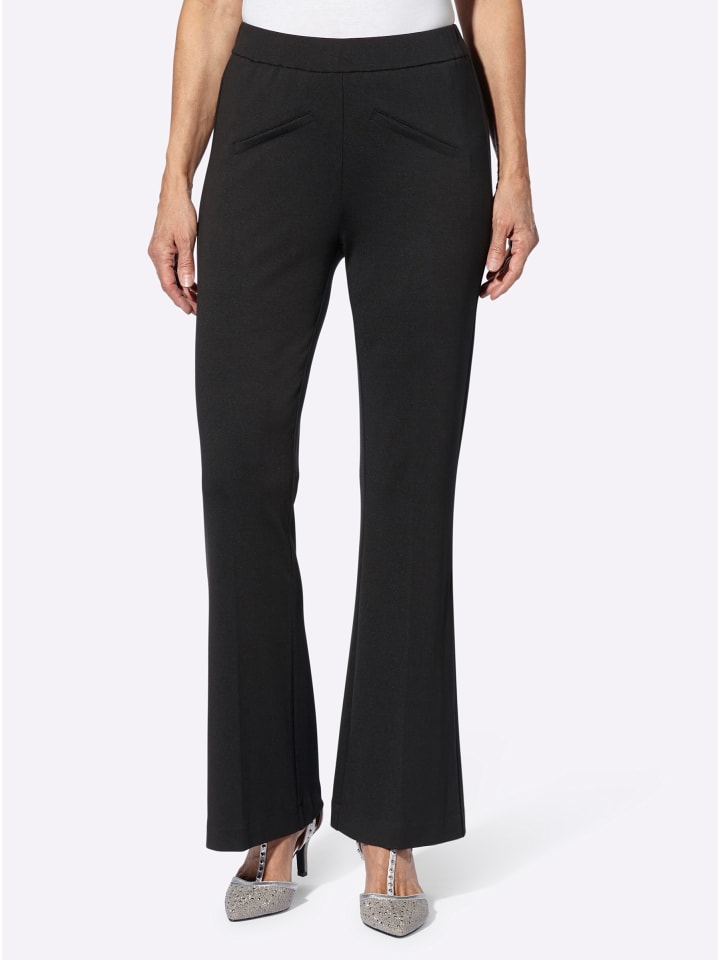 Элегантные брюки из джерси со слегка расклешенным кроем. Удобный фасон с внутренней резинкой на поясе. Вытачки сзади, аккуратные заутюженные складки спереди и сзади. Два косых кармана. Вискоза ECOVERO от Lenzing. Длина брючины примерно 58 см.