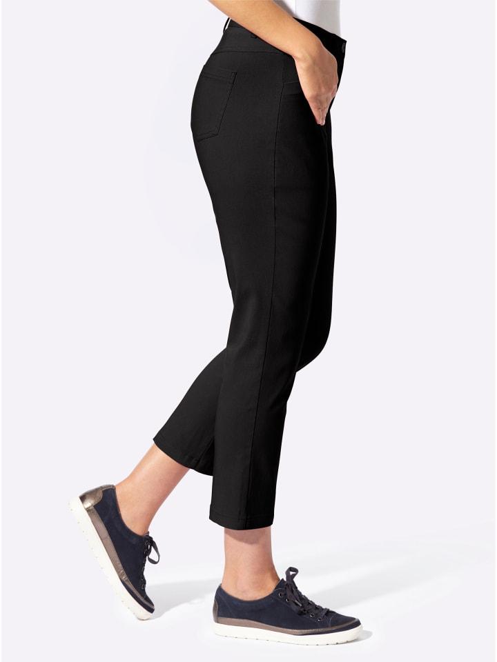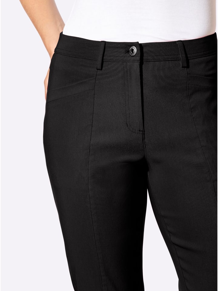 Эти брюки 7/8 отвечают сразу трем модным требованиям: они идеально сидят, невероятно удобны и создают великолепный силуэт! Они имеют эластичный пояс сзади, шлевки для ремня и застежку на пуговицу и молнию. Два боковых кармана спереди и два накладных кармана сзади. Короткие разрезы для ног завершают образ. Разделительный шов визуально удлиняет и стройнит ноги. Длина брючины примерно 38 см. Ремень не входит в комплект.