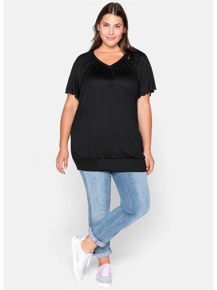 Рубашка с короткими, слегка волнистыми рукавами-крылышками. Этот летний топ украшен декоративной отделкой и присборен на V-образном вырезе. Широкая резинка по подолу обеспечивает особенно облегающую посадку.