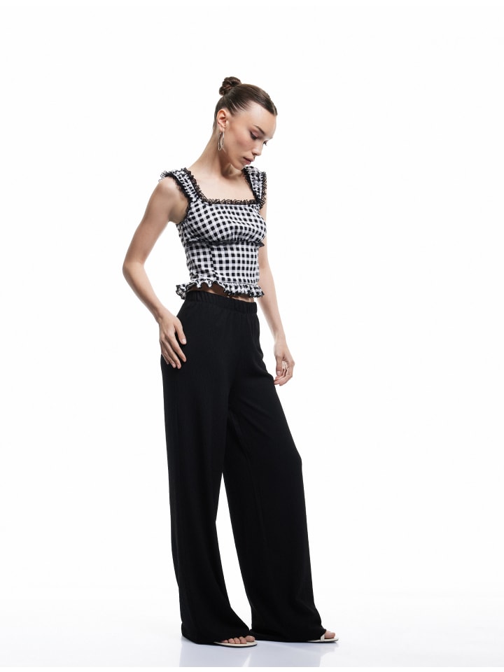 Эти брюки широкого кроя обеспечивают непревзойденный комфорт благодаря эластичному поясу и манжетам с защипами. Современный дизайн с высокой талией и широкими брючинами делает их идеальным дополнением к любому случаю. Носите их как повседневно, так и элегантно для создания стильного образа.
