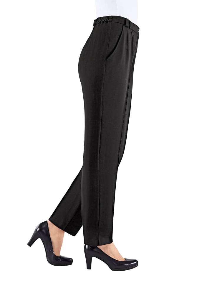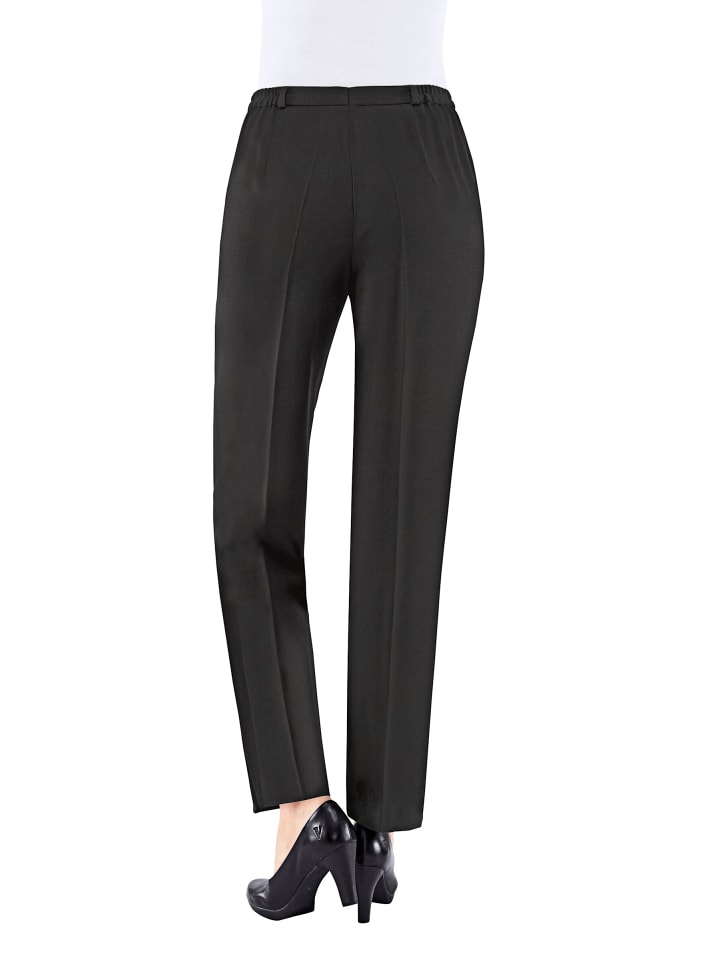 Классические брюки с оптимальной посадкой. Спереди декоративный клапан и цепочка. Пояс на резинке по бокам и карманы. Прорези для ног, застежка на пуговицу и молнию спереди, шлевки для ремня.