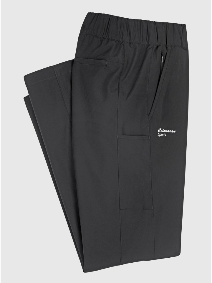 Эти функциональные брюки от Catamaran Sports - идеальный выбор для тех, кто любит проводить время на свежем воздухе. Они дышащие, быстросохнущие, удобные благодаря эластичной ткани, а также водо- и ветроустойчивые. Эластичный пояс обеспечивает удобную посадку, а ластовица сзади - плотное прилегание. Практичные особенности включают два боковых кармана с прорезями, один из которых с внутренним карманом на молнии, два набедренных кармана (один с дополнительным накладным карманом на молнии) и прорезной карман на молнии сзади. Под правым карманом расположен принт с логотипом. Изготовлено из переработанного полиэстера.
